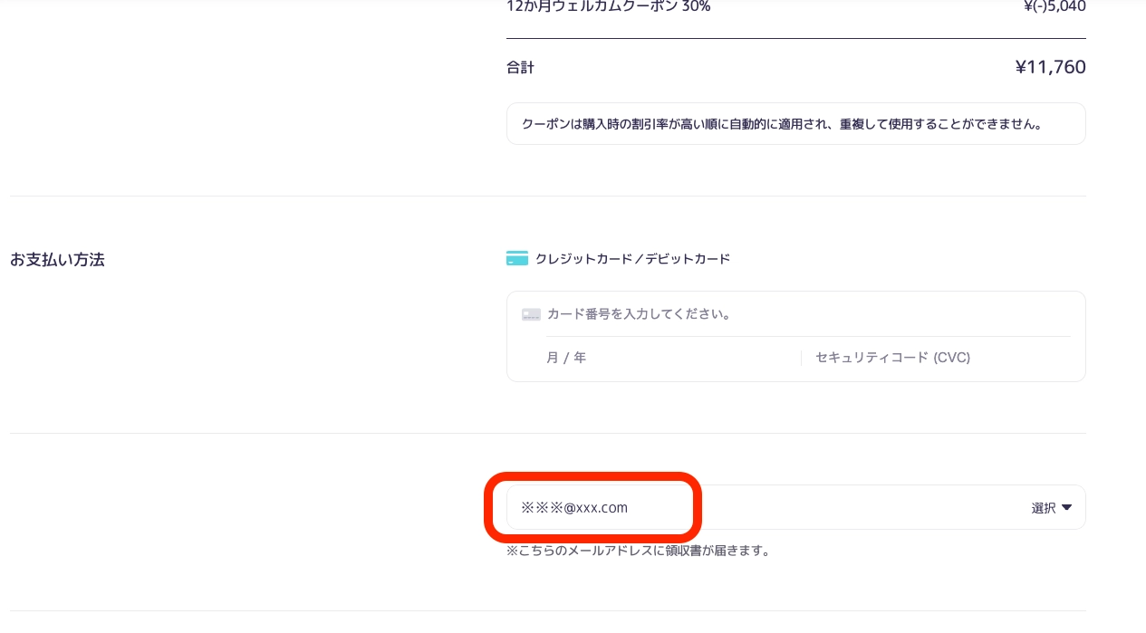 6か月プラン、12か月プランを公式サイトから購入される場合、購入時にクレジットカード情報入力欄の下へメールアドレスを入力ください。入力いただいたメールアドレス宛に領収書が自動で届きます。
