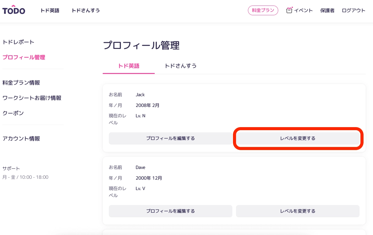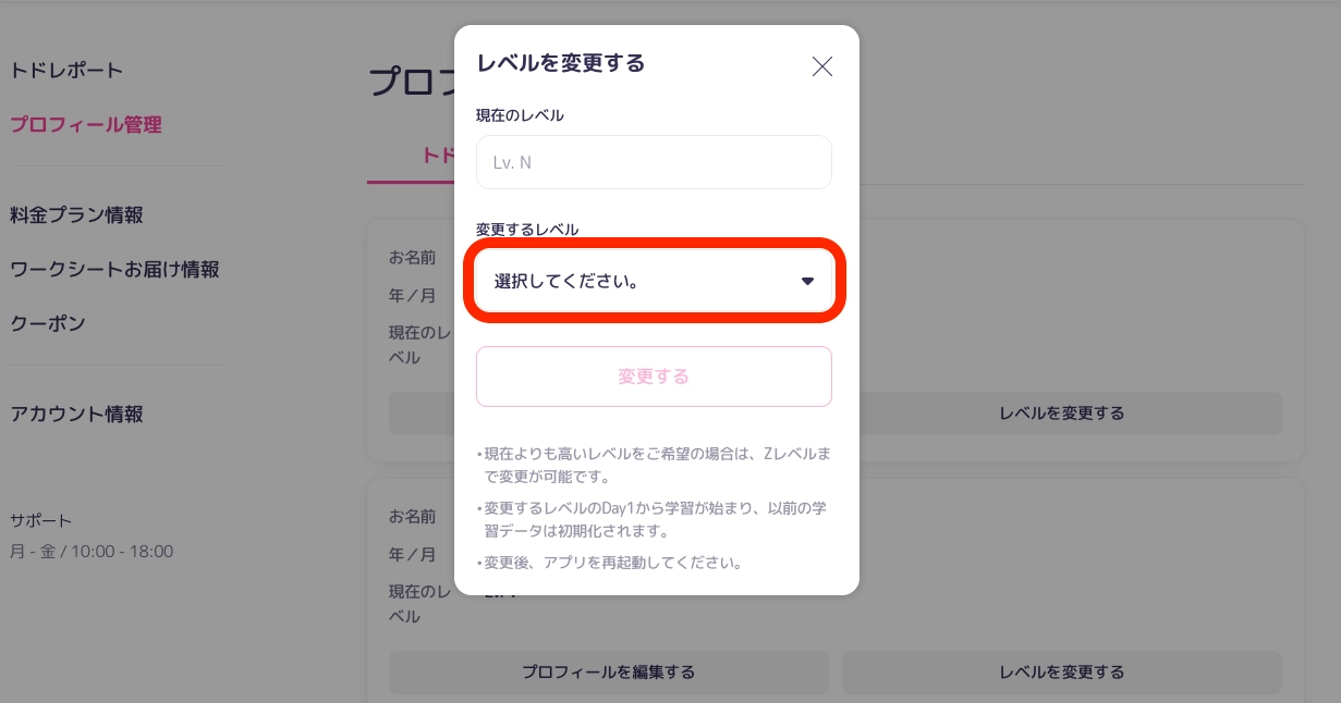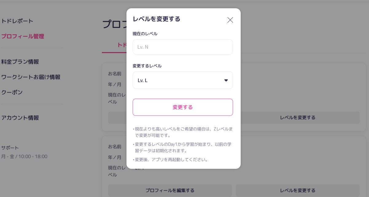 公式サイトへログインし、[保護者ページ]>[プロフィール管理]画面で[レベルを変更する]をタップしてください。