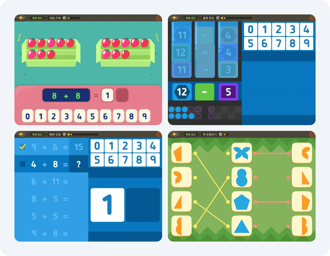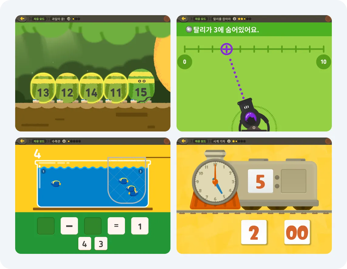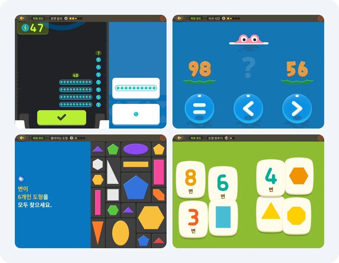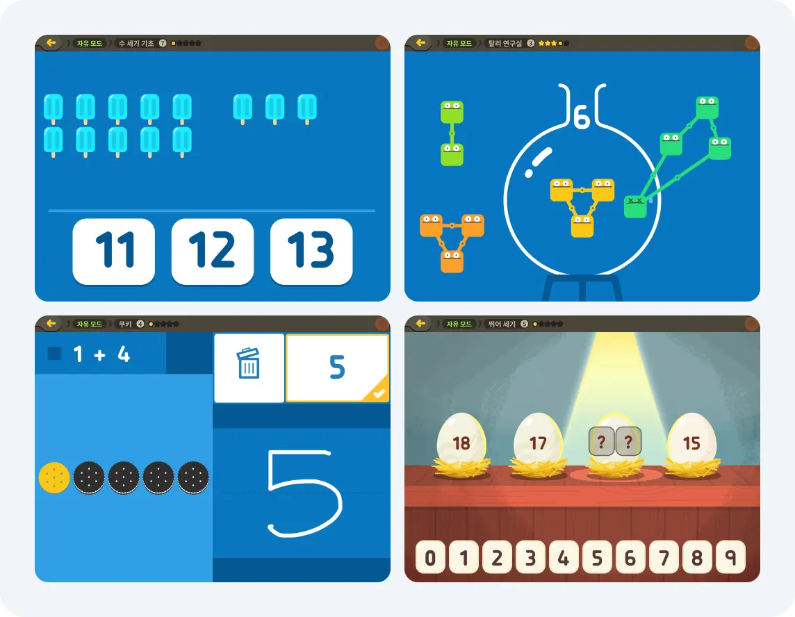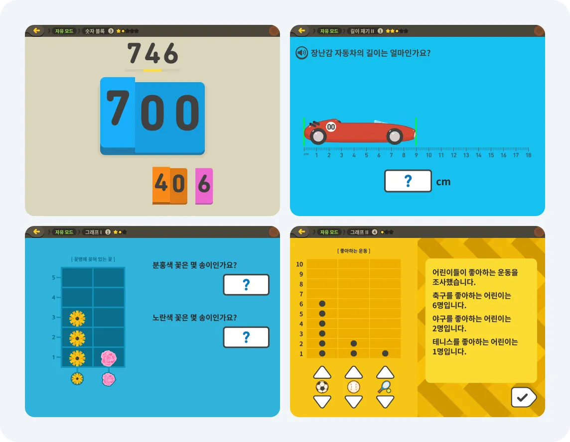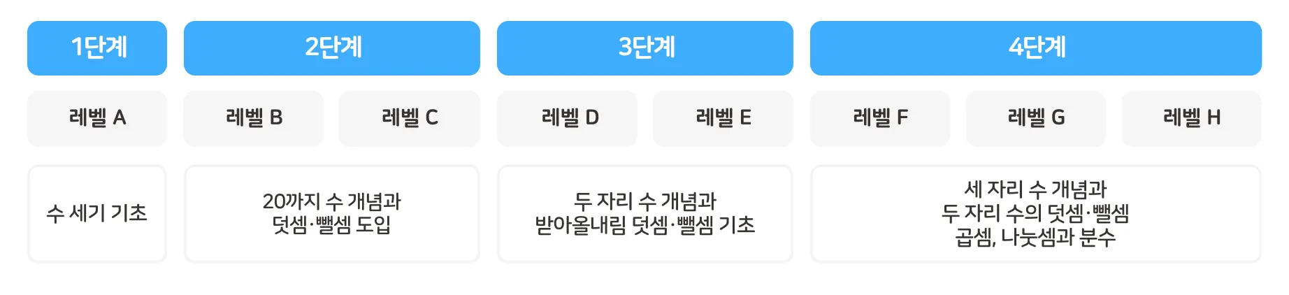토도수학 [오늘의 모험] 커리큘럼은 레벨 A부터 H까지 총 8개의 레벨로 구성되어 있습니다. 10까지 수를 세고 도형의 이름과 모양을 익히는 유아 수학에서부터, 두 자리 수의 덧셈・뺄셈과 곱셈구구를 하는 초등 2학년 수준까지의 내용을 담고 있어 수학의 기본기를 탄탄히 갖출 수 있습니다.