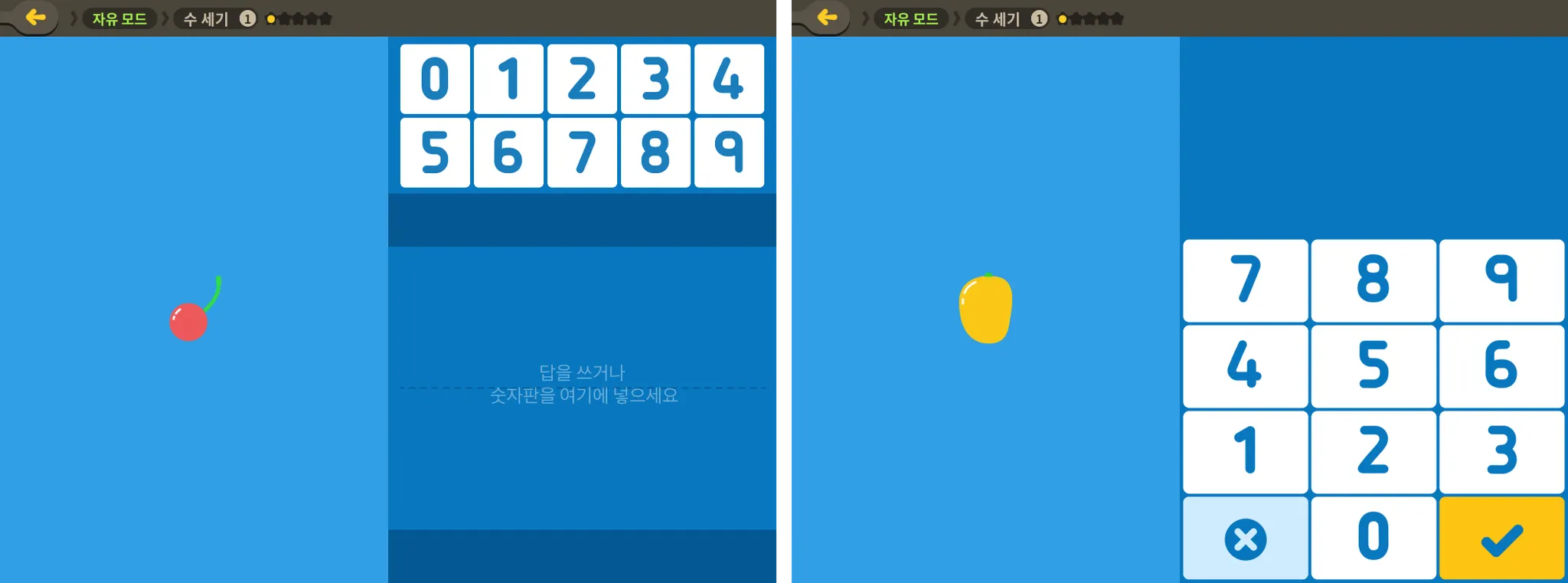 (왼쪽) 기본 입력 방식: 숫자판을 드래그하거나 직접 숫자를 씀 - (오른쪽) 키패드 입력 방식