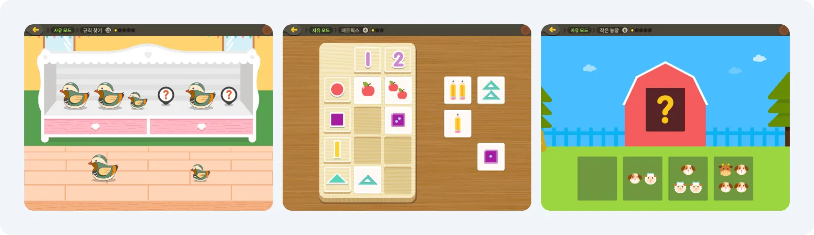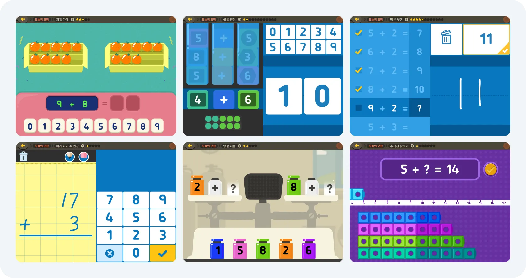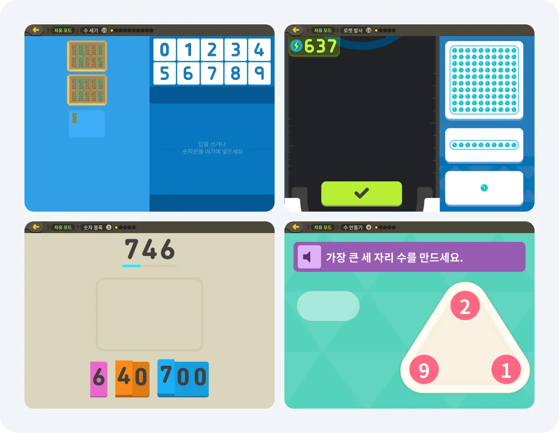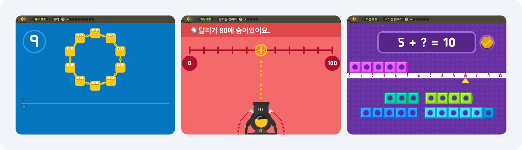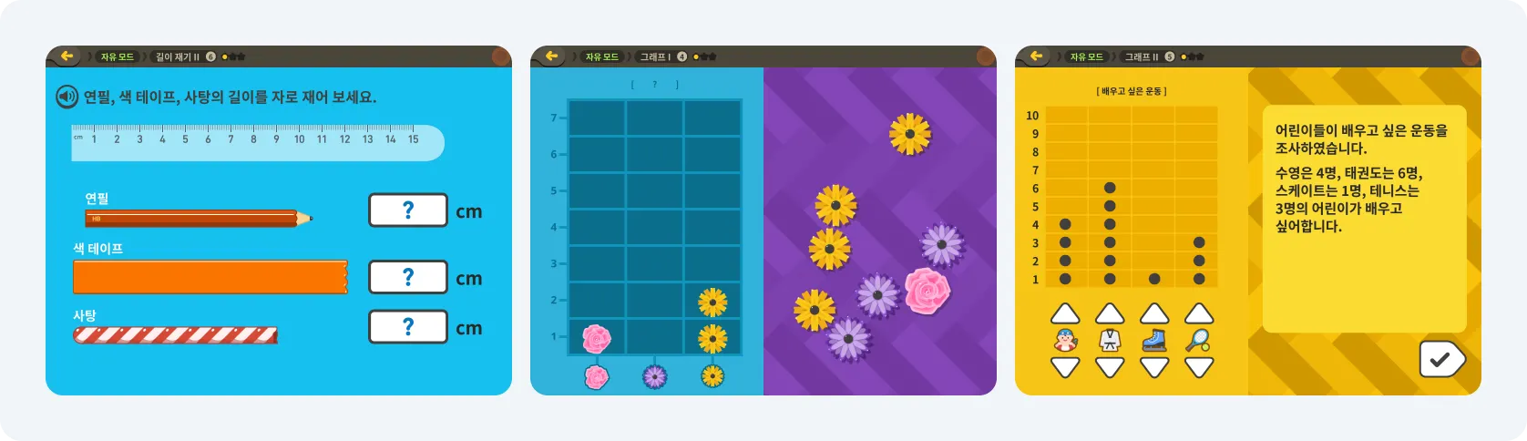 시각, 청각, 촉각 등 감각적인 즐거움을 주는 게임 기반 액티비티는 학습자들이 즐겁게 조작하는 사이 자연스럽게 수학의 주요 개념을 학습하도록 돕습니다.