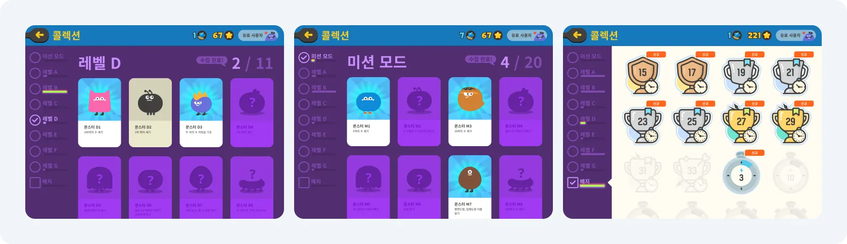 몬스터 콜렉션: 오늘의 모험과 미션을 진행하면서 잡은 몬스터를 볼 수 있는 곳으로, 달성한 학습 목표를 확인하고 복습할 수 있습니다.