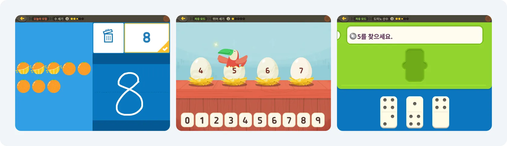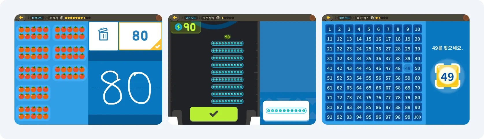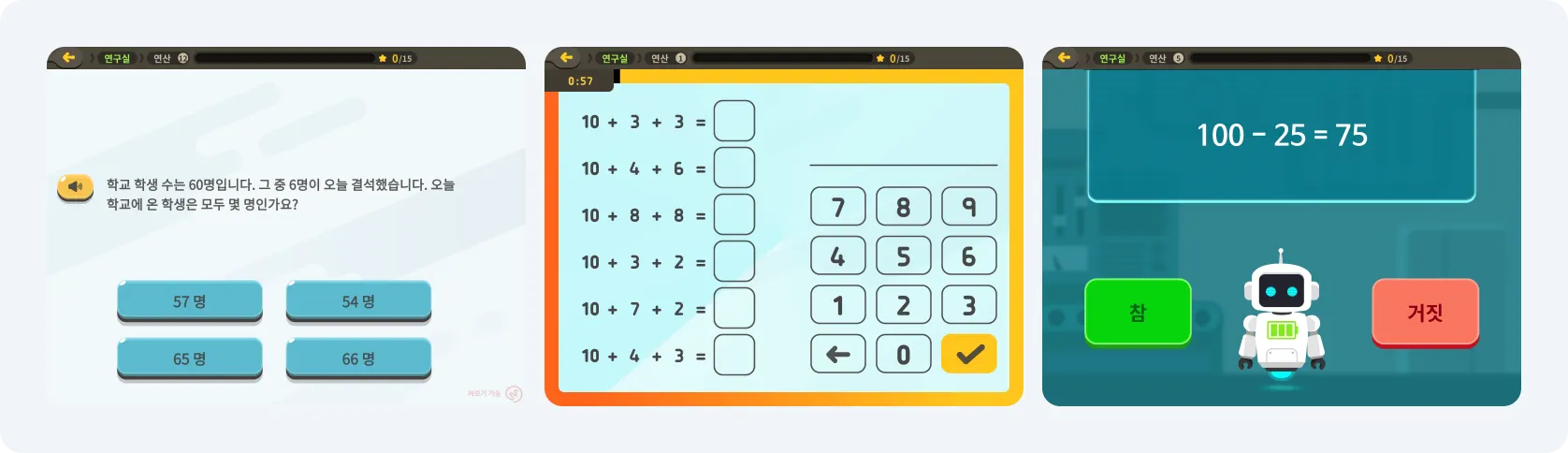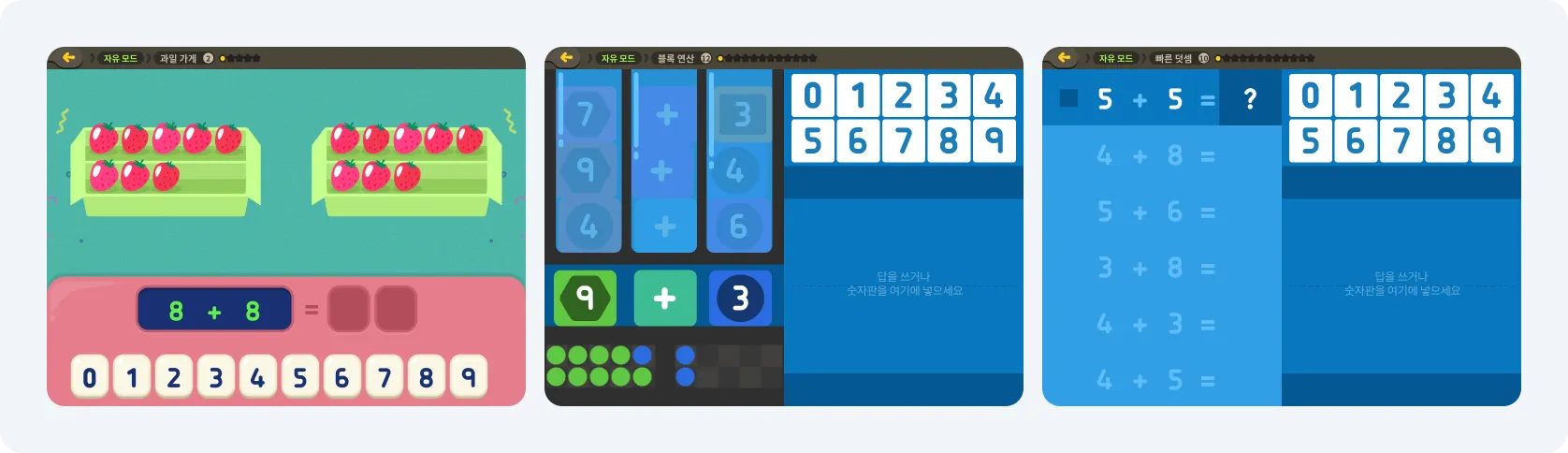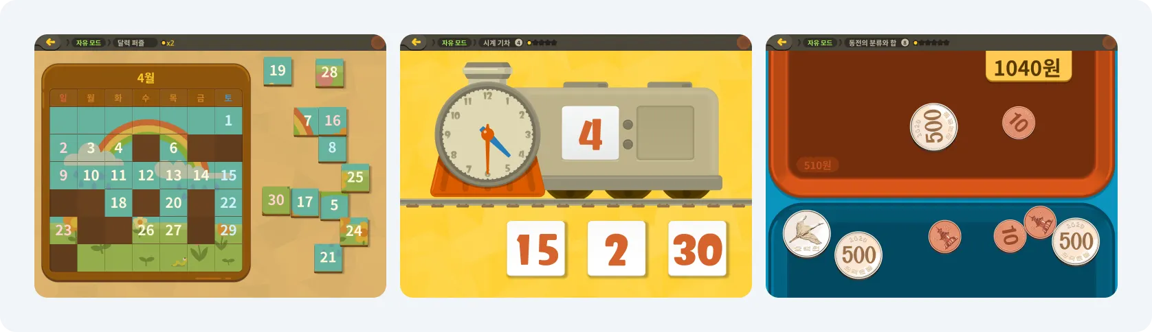 게임 기반 액티비티 자체의 재미, 꾸준히 학습을 지속하게 만드는 보상 시스템 등을 통해 학습자는 수학에 흥미를 붙이고 자기주도적으로 학습할 수 있습니다.