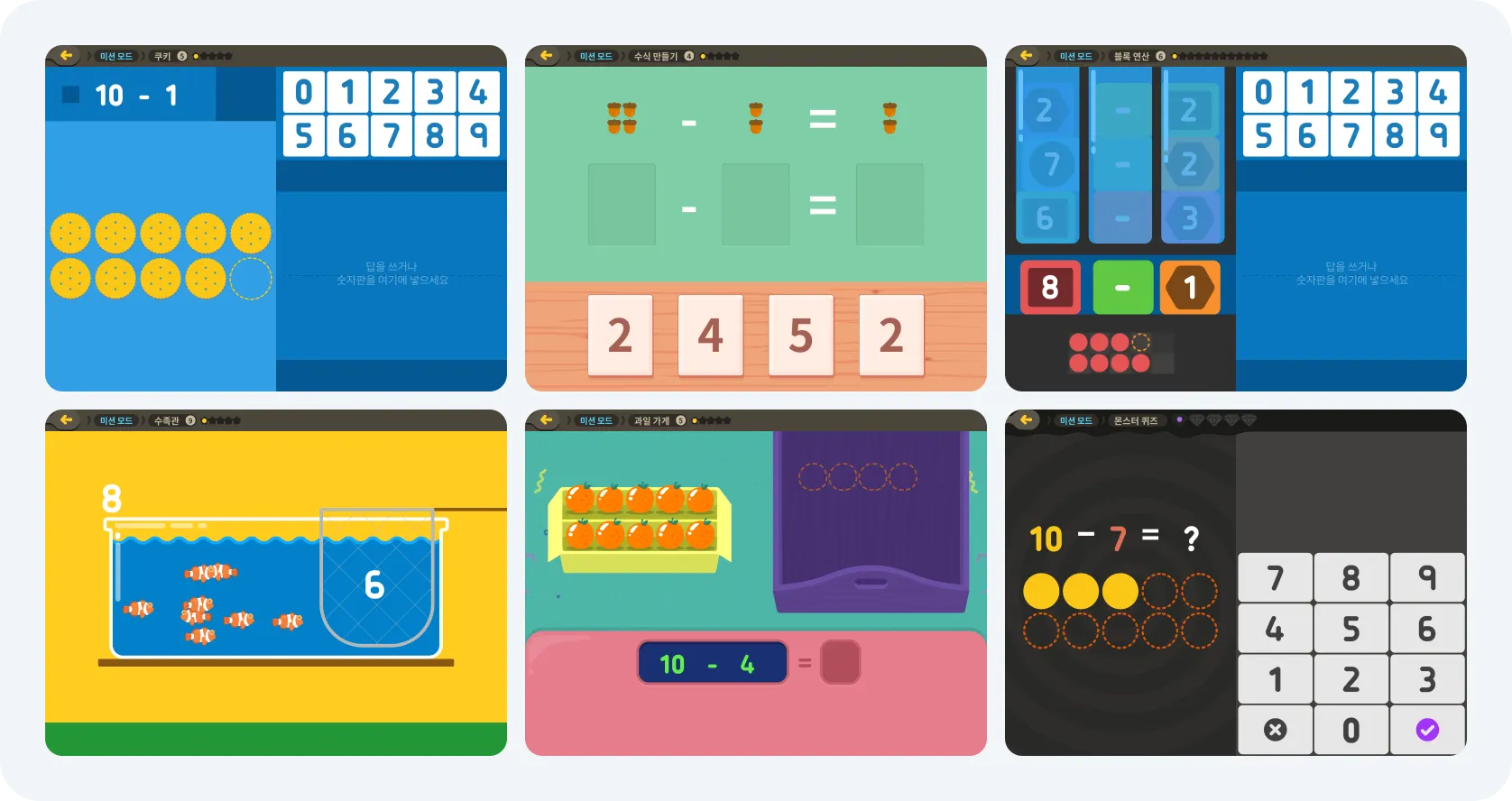 수, 연산, 도형, 측정 등 여러 영역의 학습 주제가 미션으로 제시되고, 각 주제와 관련된 액티비티를 플레이하며 해당 주제를 집중적으로 학습할 수 있습니다.