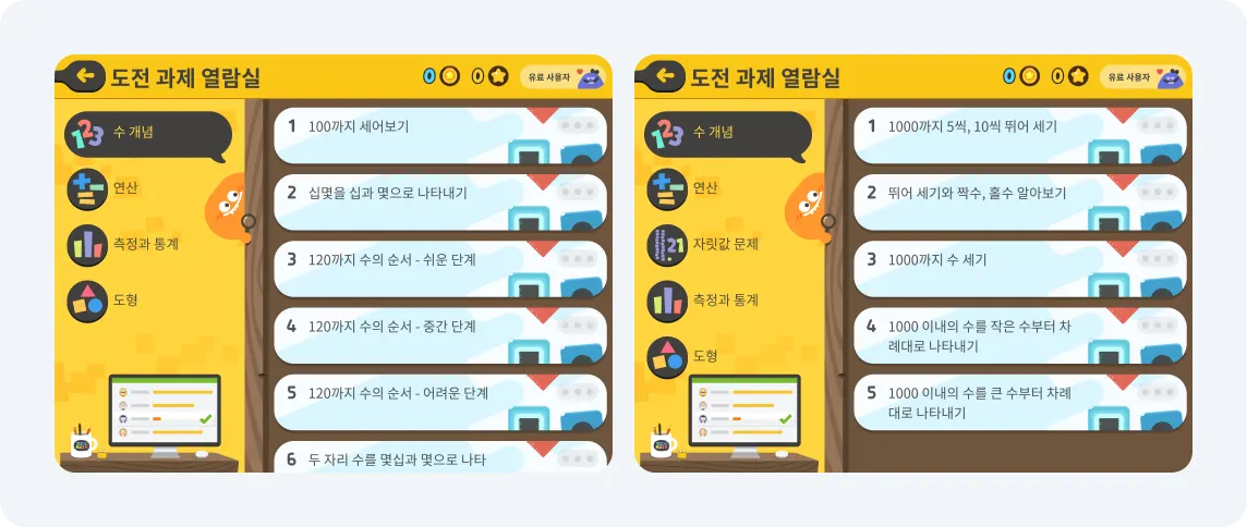 특정한 주제를 집중적으로 반복 연습할 수 있도록 여러 형식과 난이도로 구성된 과제를 제시합니다. E레벨 이상의 학습자에게 수 개념, 연산 등 영역별로 과제가 제공되며 레벨에 따라 다른 도전 과제가 준비되어 있습니다.