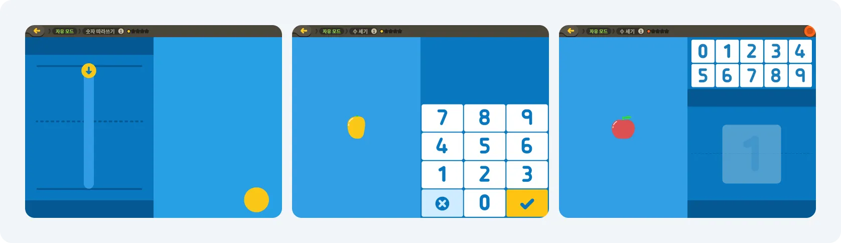 보편적 학습 설계(Universal Design for Learning)를 통해 모두가 쉽게 학습할 수 있도록 함과 동시에, 특히 어려움을 겪는 학습자를 고려하였습니다. 손가락을 잘 움직이지 못하는 학습자를 위해 드래그나 필기 인식 같은 입력 방식 대신 쉽게 숫자를 입력할 수 있는 키패드를 제공합니다. 왼손잡이 학습자도 앱을 편리하게 사용할 수 있는 ‘왼손잡이 모드’, 혼자 학습하는 상황에서 실패를 반복하지 않도록 힌트를 주는 ‘도움말 버튼’ 등의 기능도 있습니다.