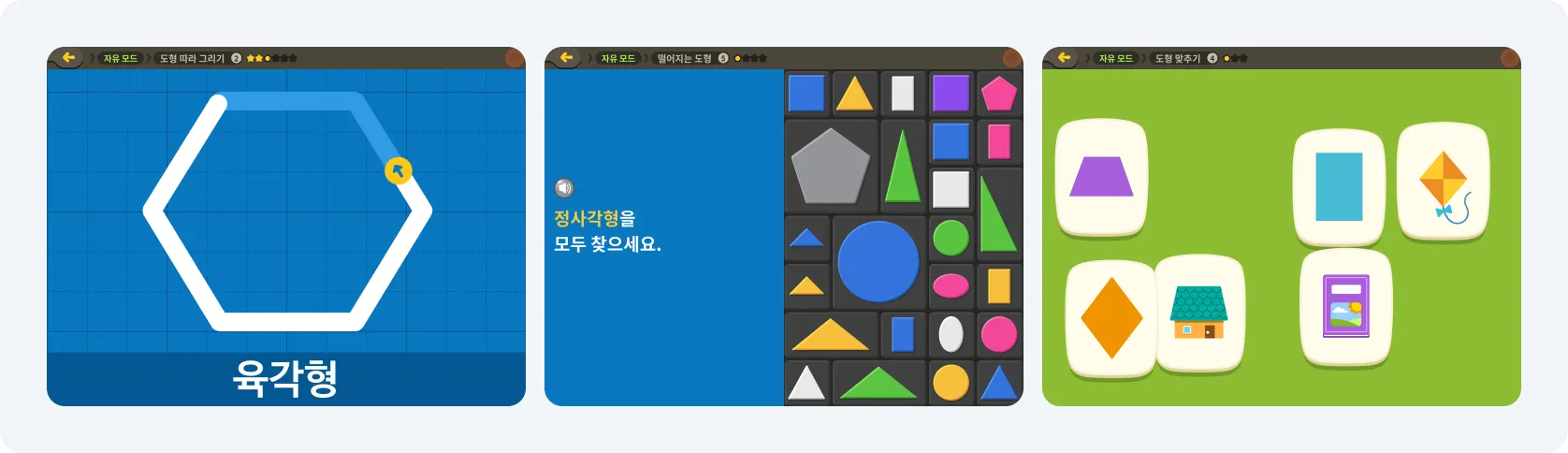도형 따라 그리기 / 떨어지는 도형 / 도형 맞추기