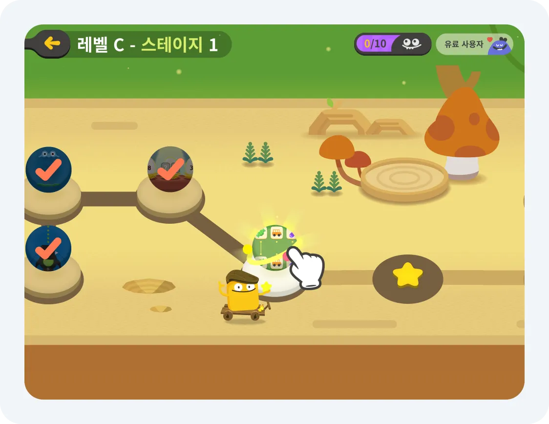 각 레벨은 더 작은 단위의 학습 목표를 가진 스테이지 10~11개로 구성되어 있고, 스테이지 내의 액티비티를 모두 끝내면 형성 평가가 나옵니다.