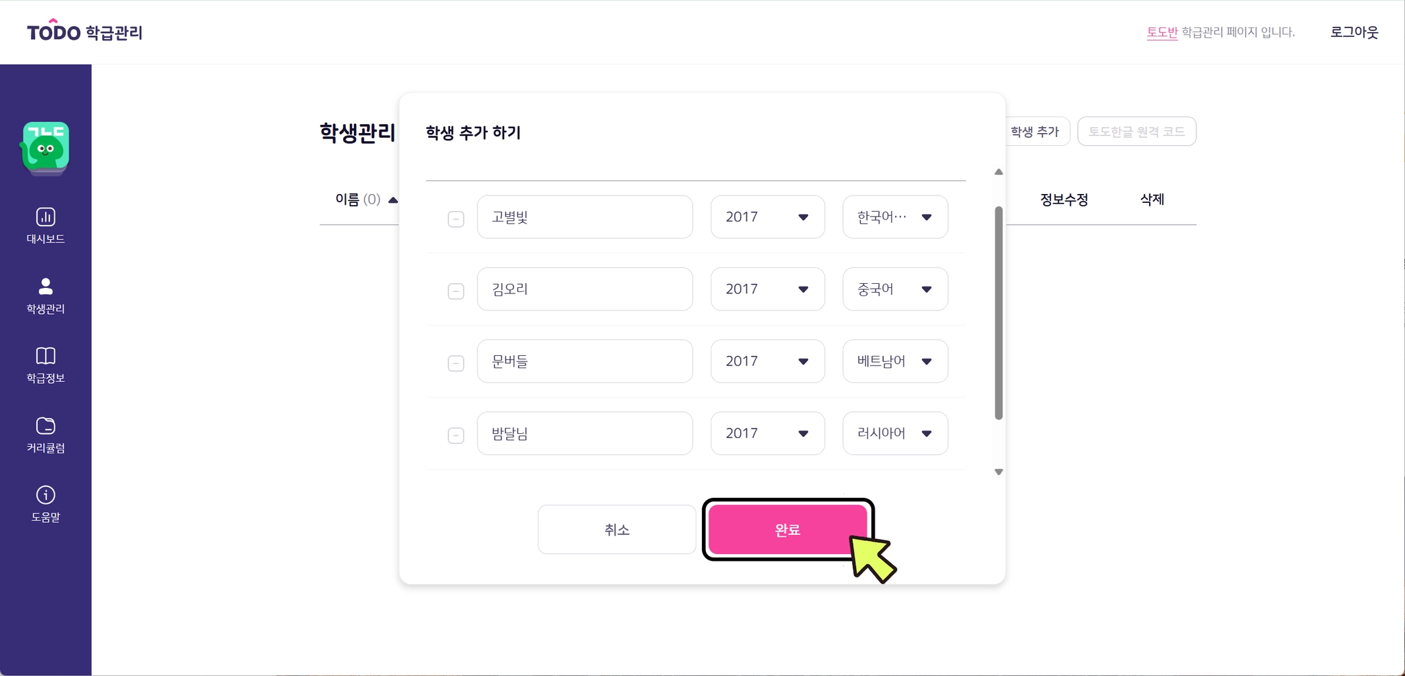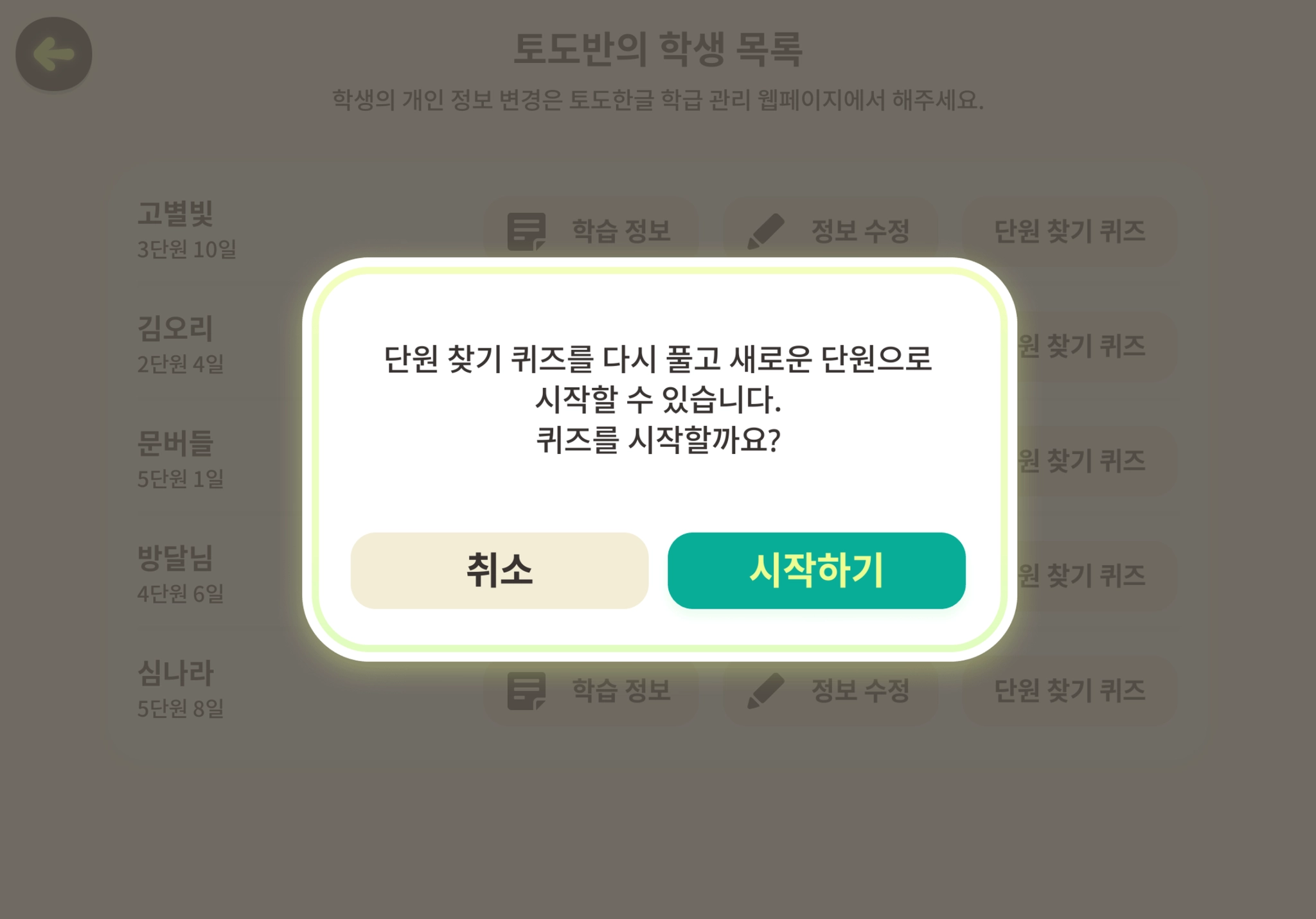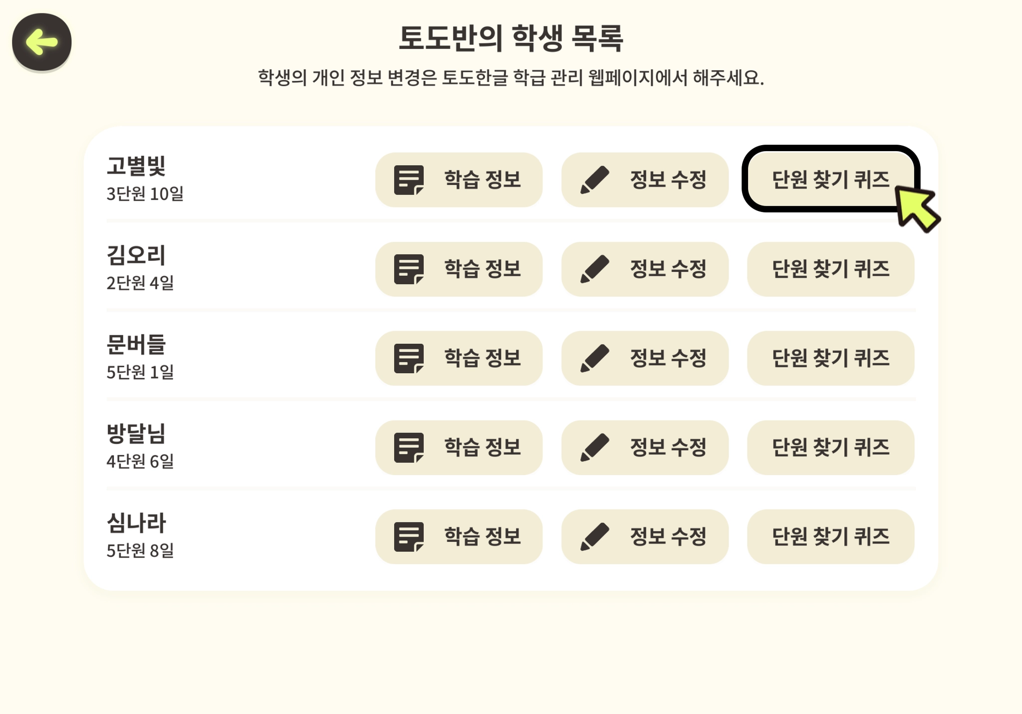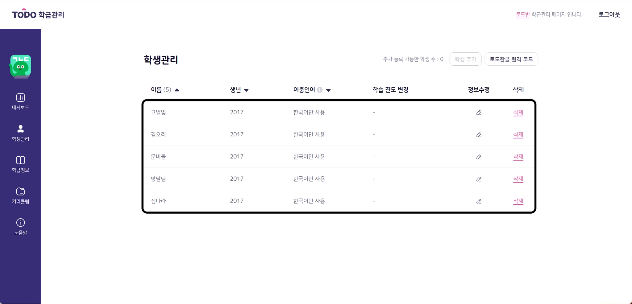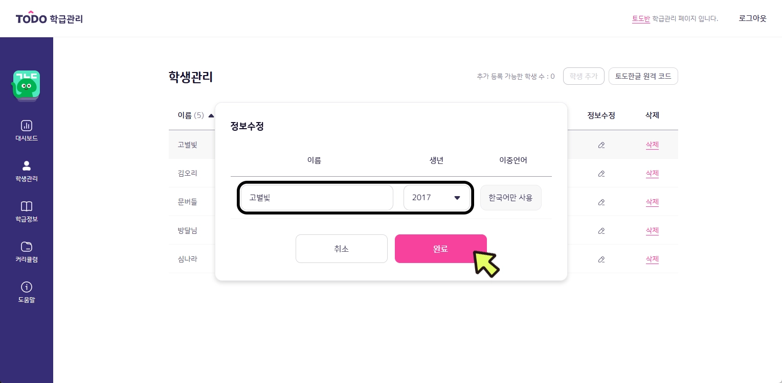 학생 이름과 생년은 학급관리 페이지에서 수정하실 수 있습니다.