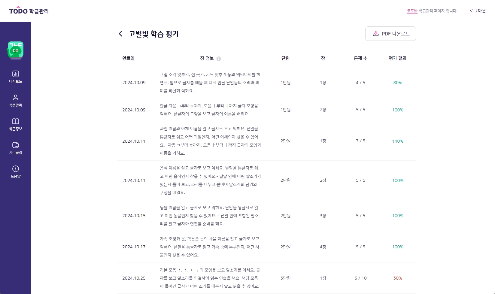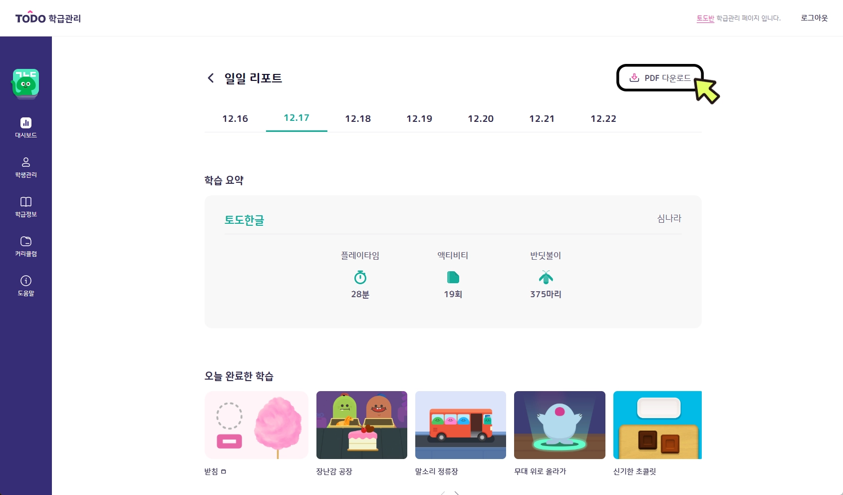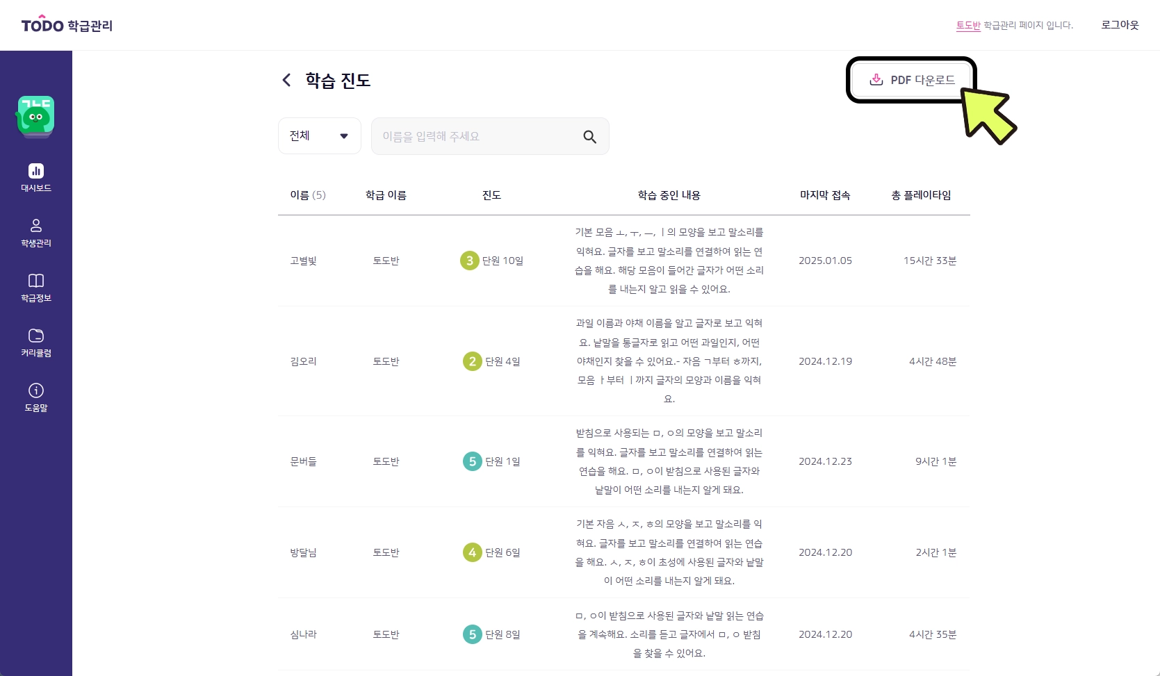 학생별 오늘의 모험 진도(단원/일), 학습 중인 내용, 마지막 접속, 총 플레이타임을 확인하고 PDF로 다운로드 받을 수 있습니다.