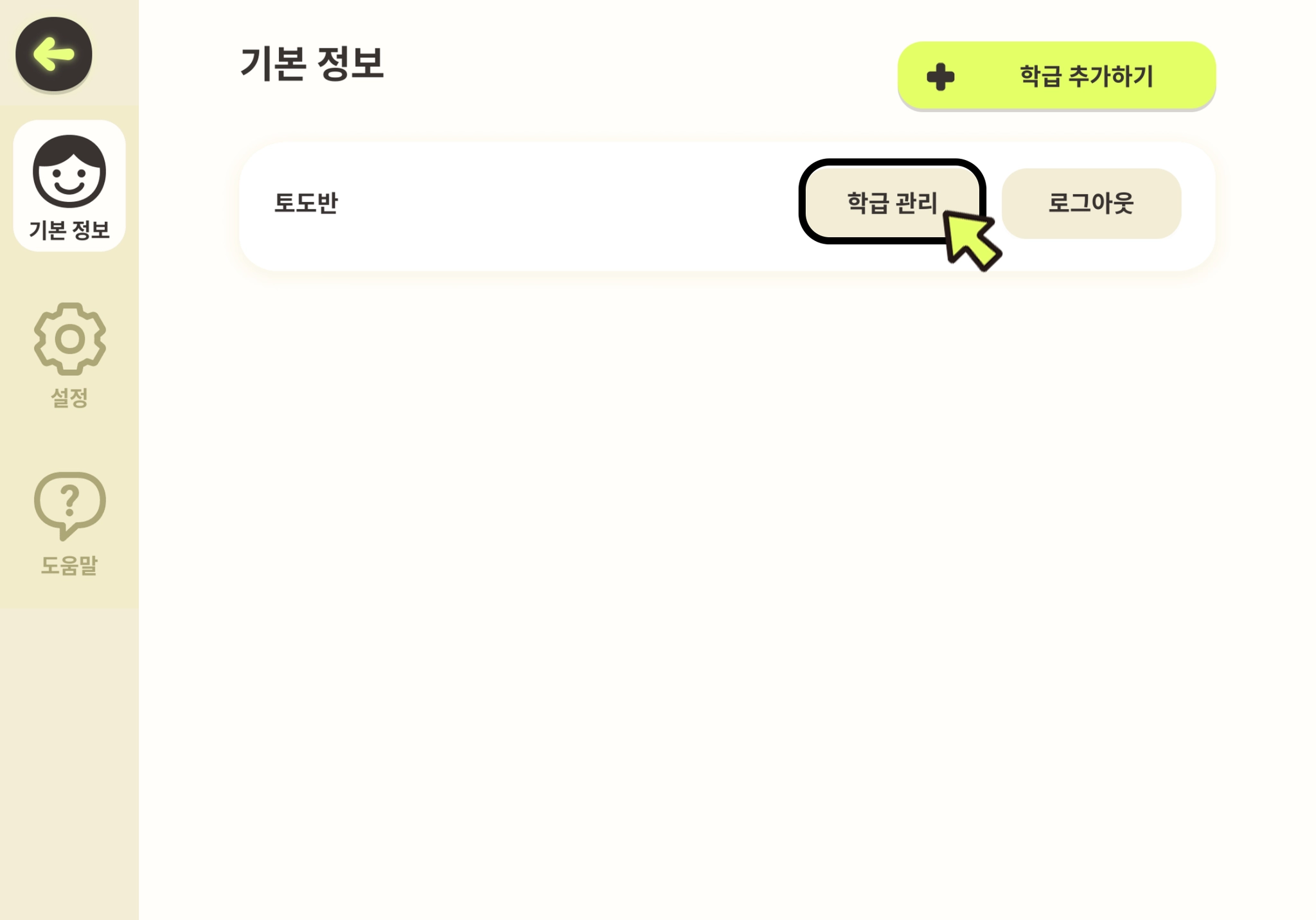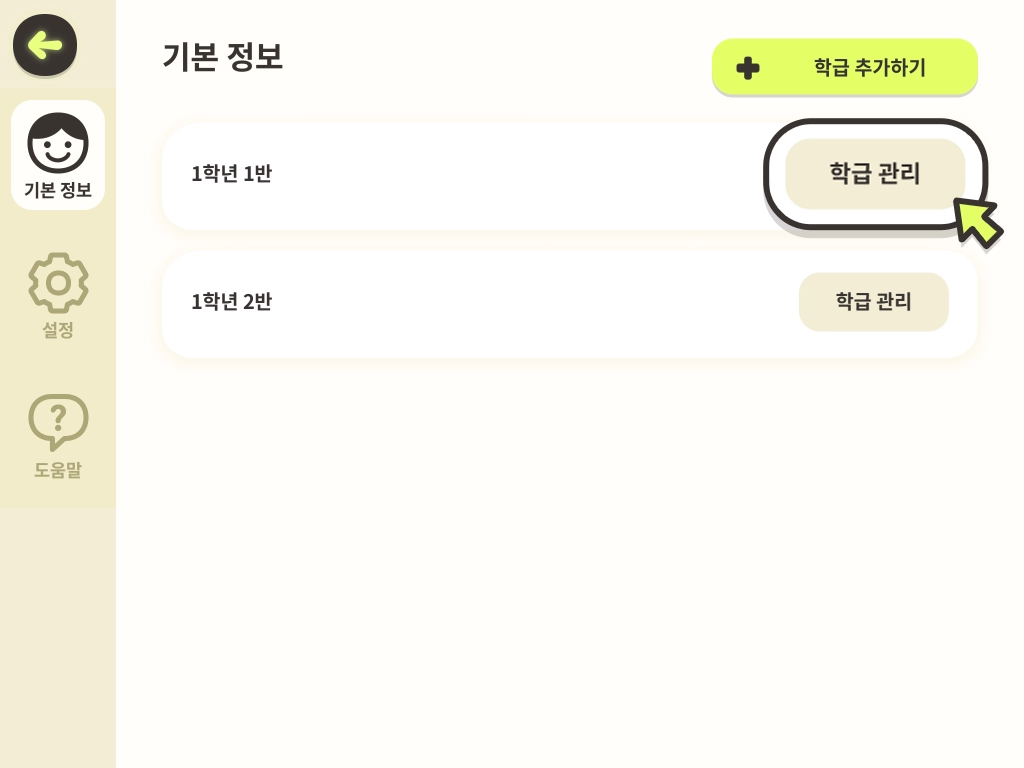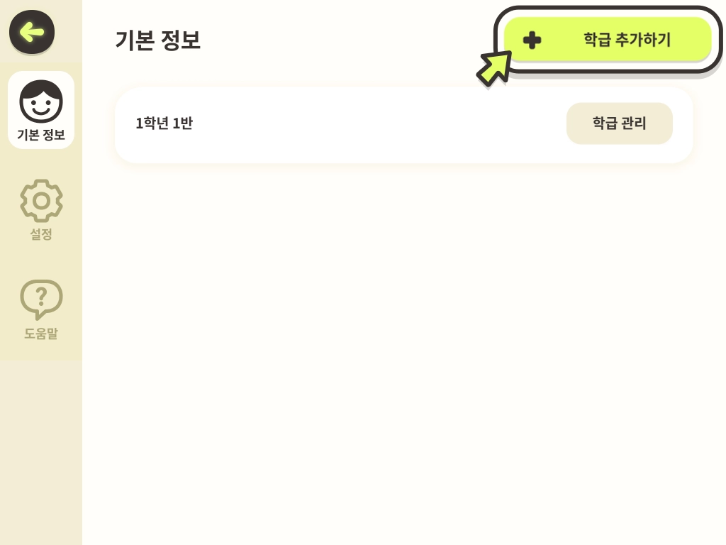 3. 선생님 메뉴 - 기본 정보 탭에 들어왔습니다. 우측 상단의 [학급 추가하기]를 누릅니다.