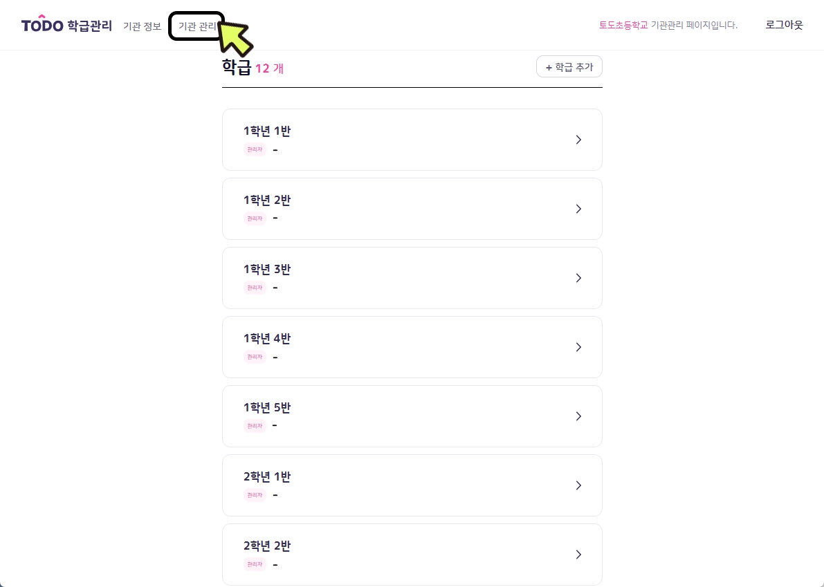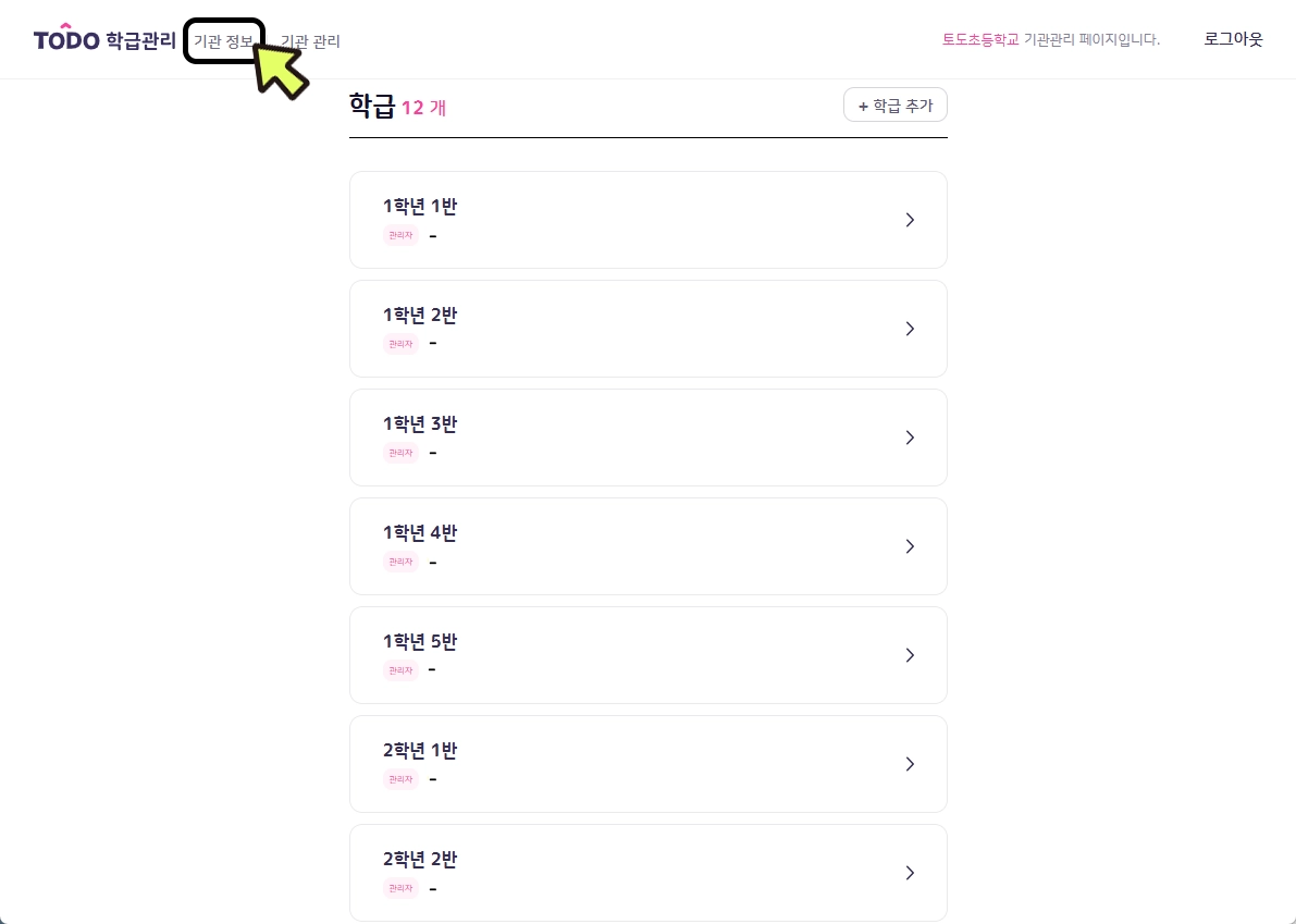 기관 로그인 시 등록된 모든 학급이 조회됩니다. 학급명을 클릭하면 해당 학급의 학급관리 페이지로 연결됩니다.
