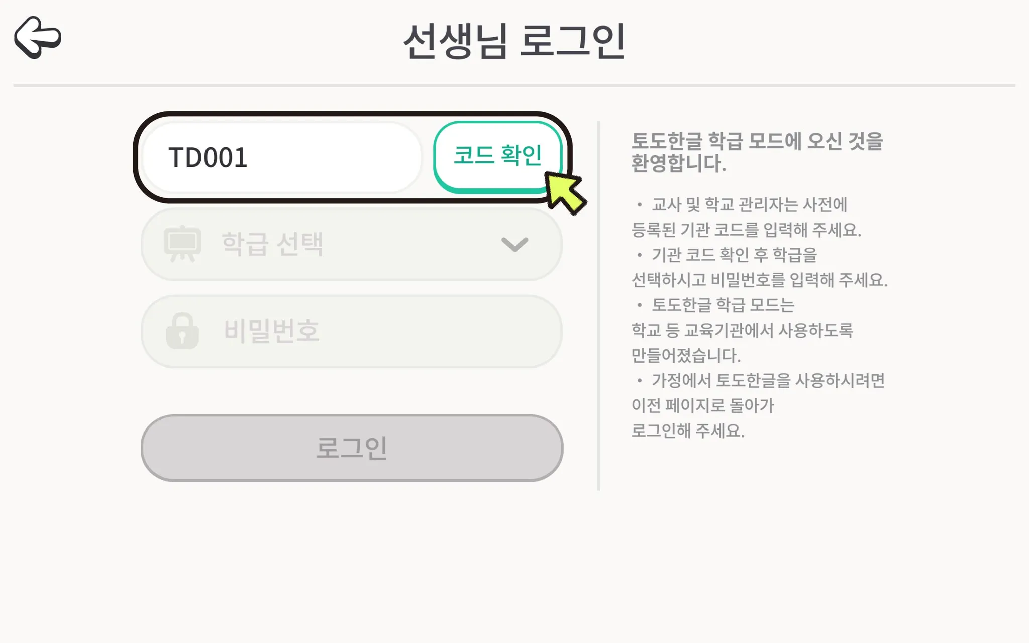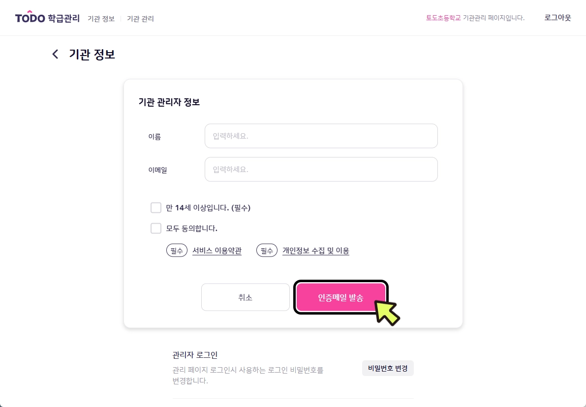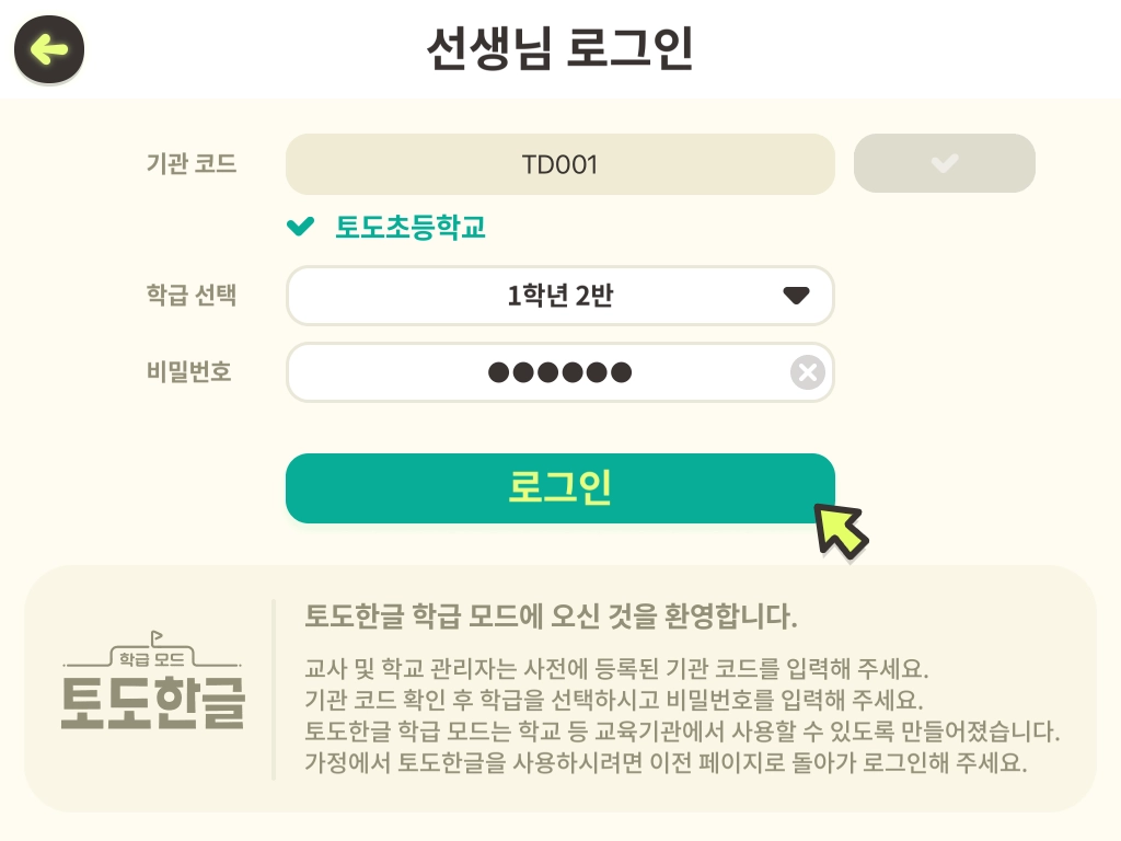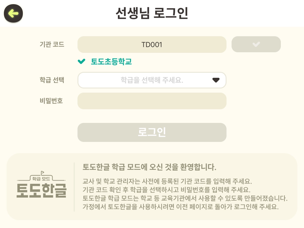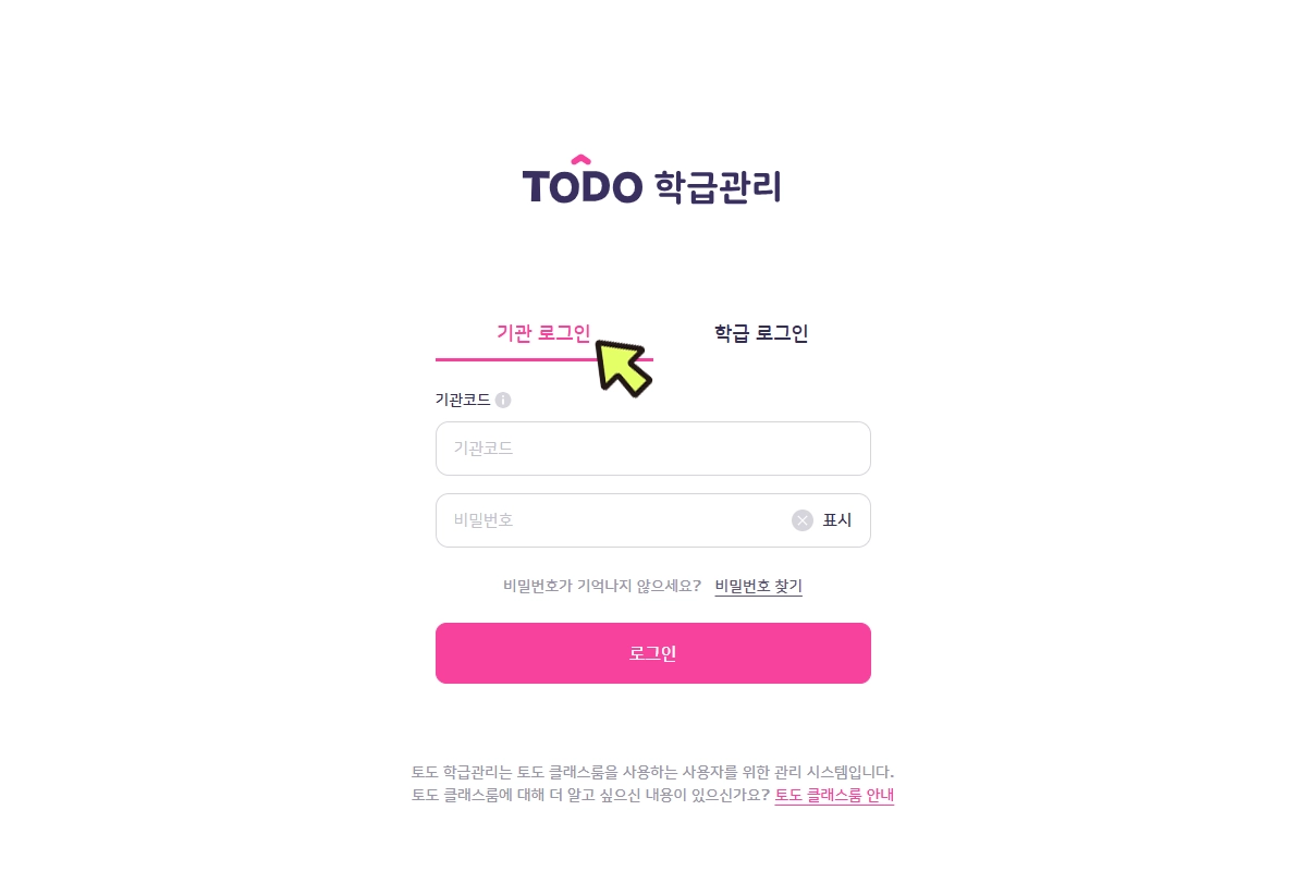 기관 코드와 임시 비밀번호는 토도 학교팀이 생성하여 기관 내 담당자에게 전달해 드립니다. 기관 코드와 비밀번호를 모르시는 경우 기관 내 담당자 또는 토도 학교팀에 문의해 주세요.