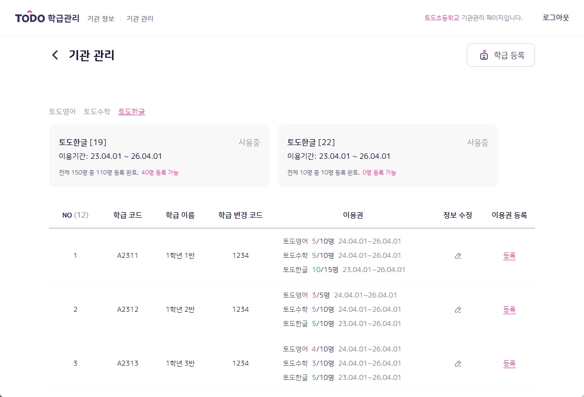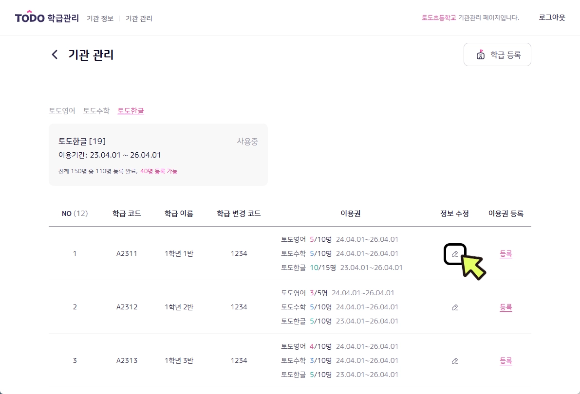 기관의 학급에 등록된 이용권을 조회하고 학급 정보를 수정할 수 있는 페이지입니다.