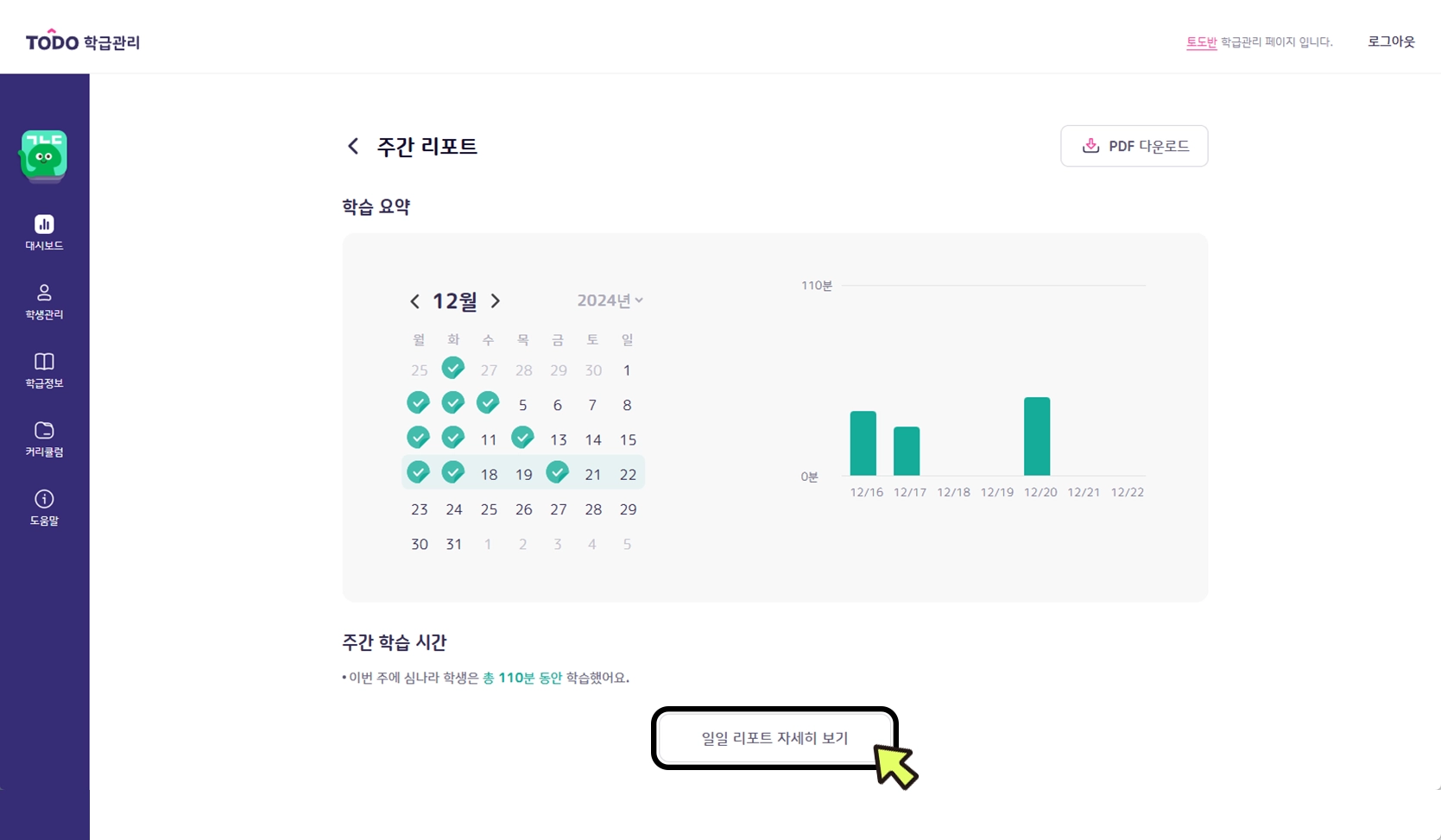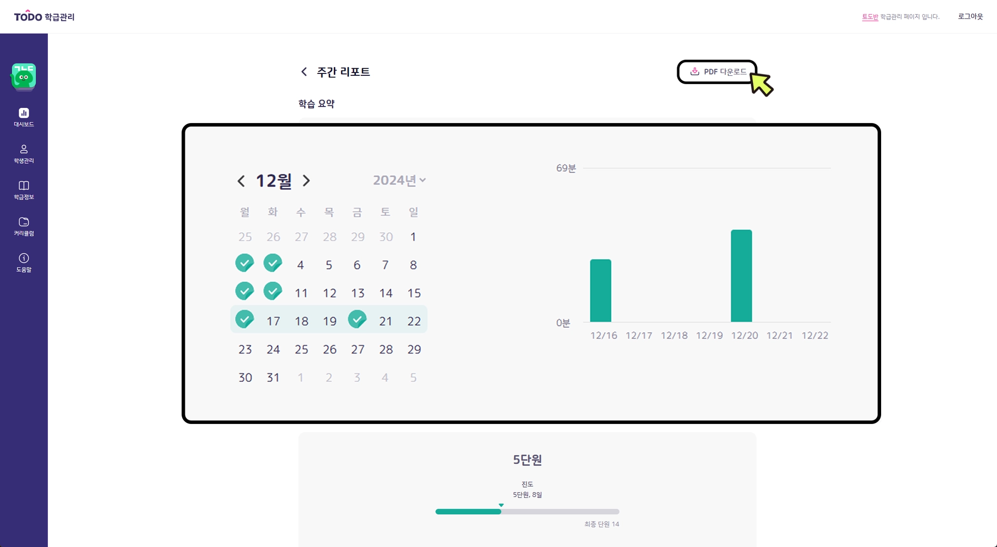 주간 리포트에서 주간 학습 시간과 학습 진도, 퀴즈의 시간 정답률을 확인할 수 있으며 PDF로 다운로드 받을 수 있습니다.