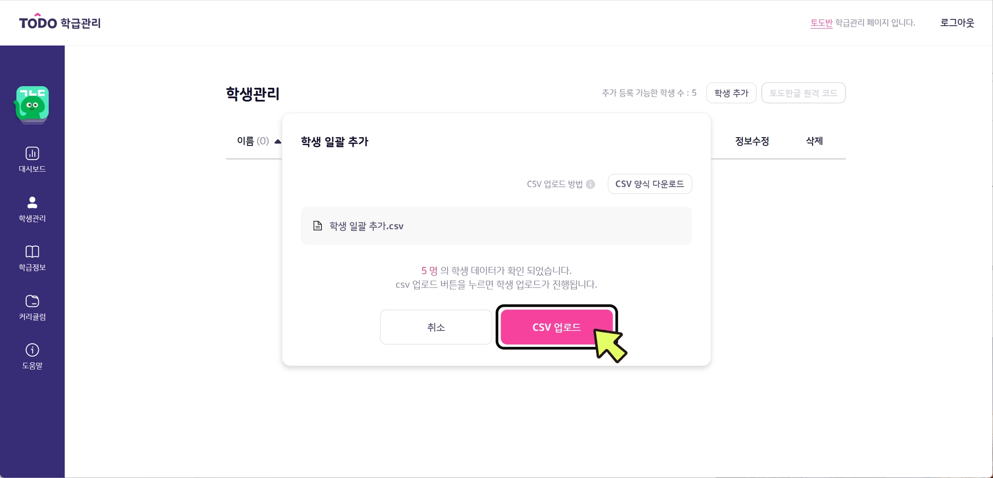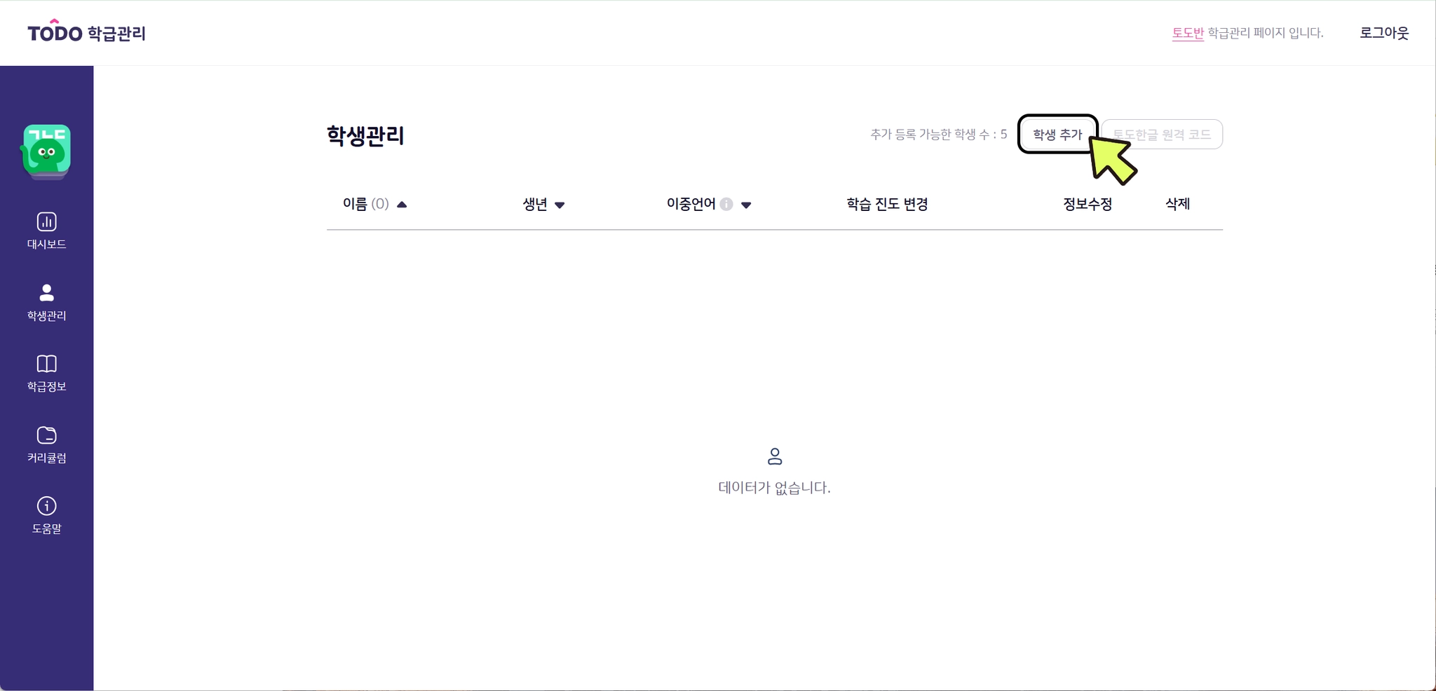 오른쪽 상단의 [학생 추가] 버튼을 클릭합니다.