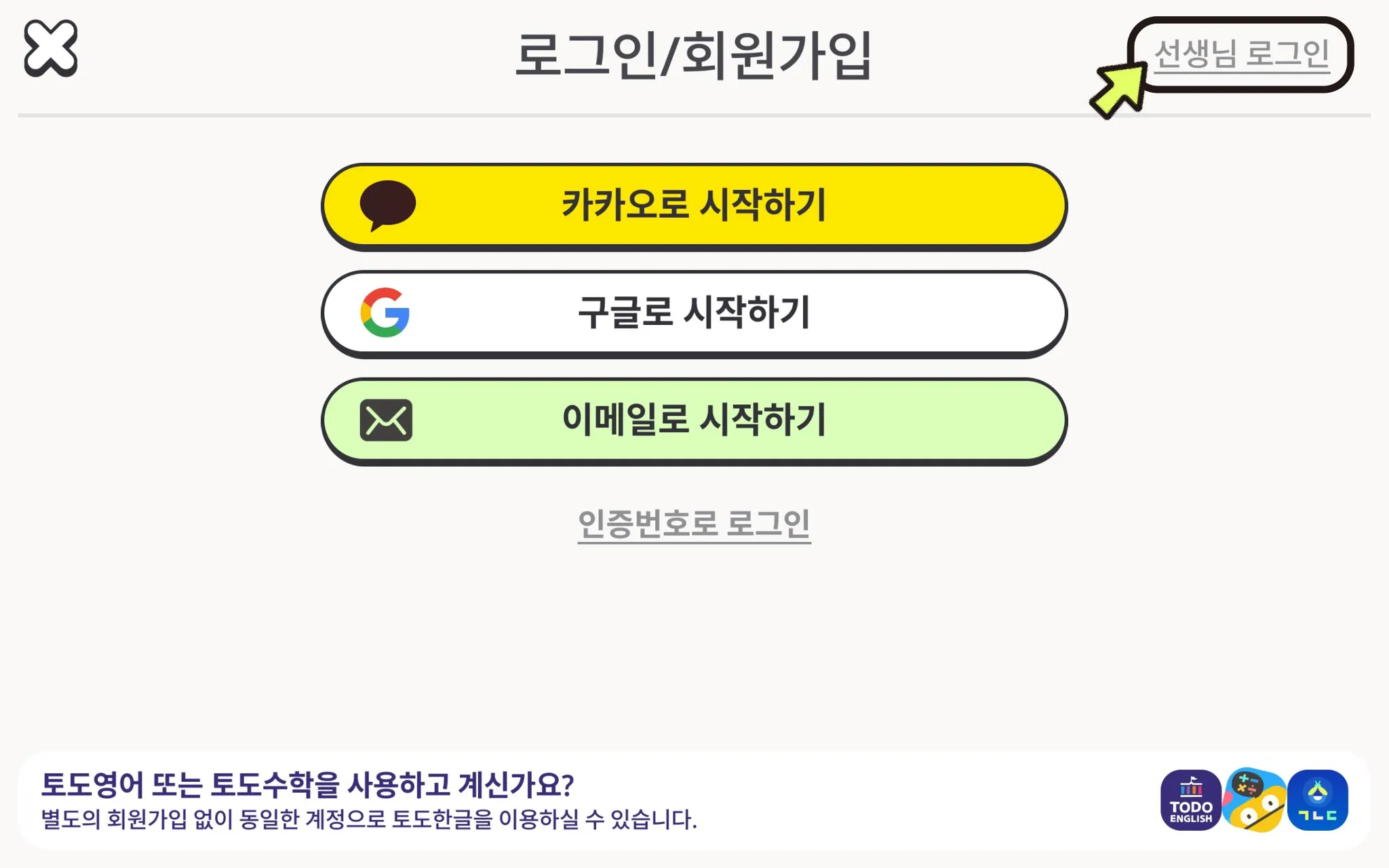 2. 로그인 화면에서 우측 상단의 [선생님 로그인]을 누릅니다.