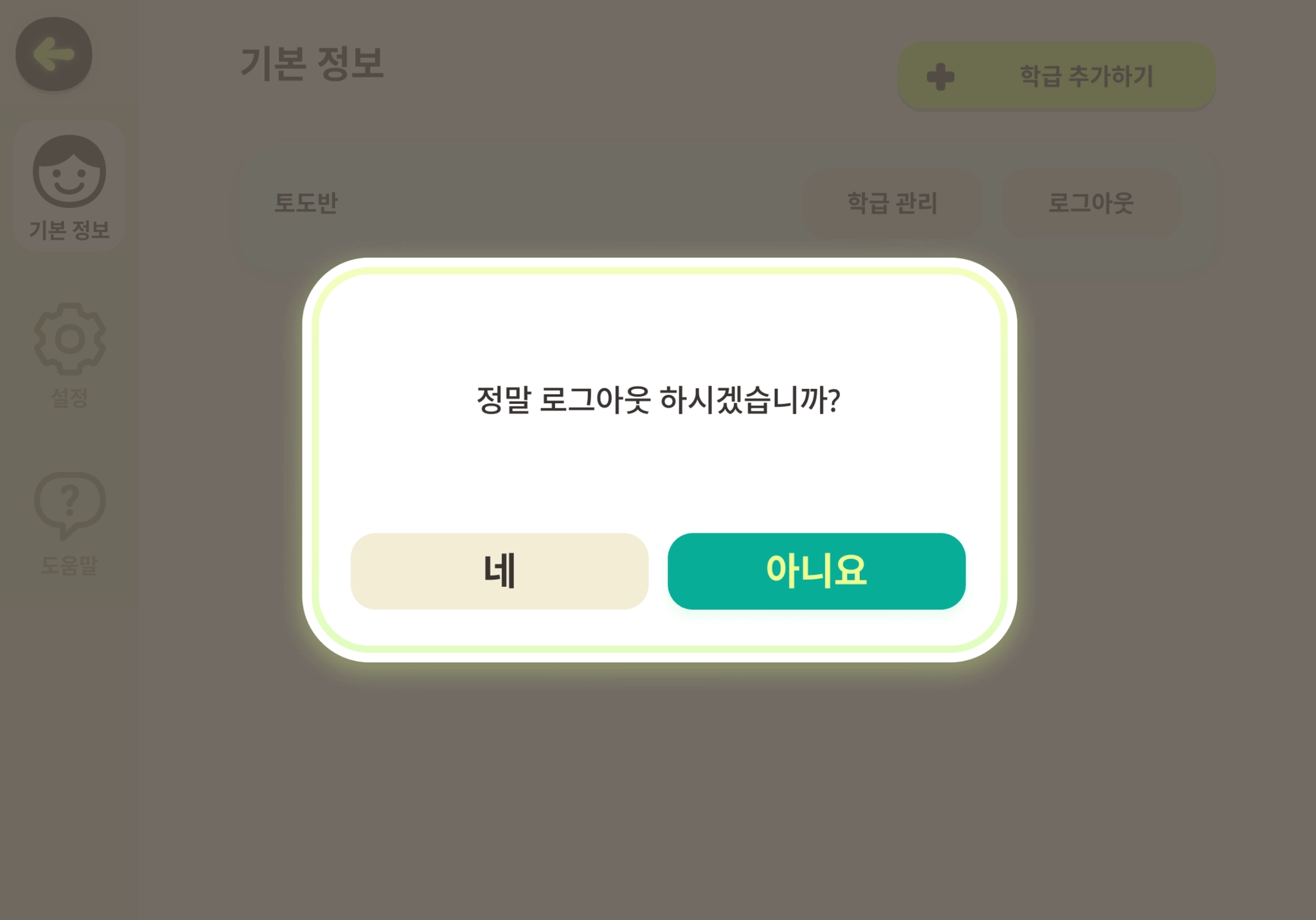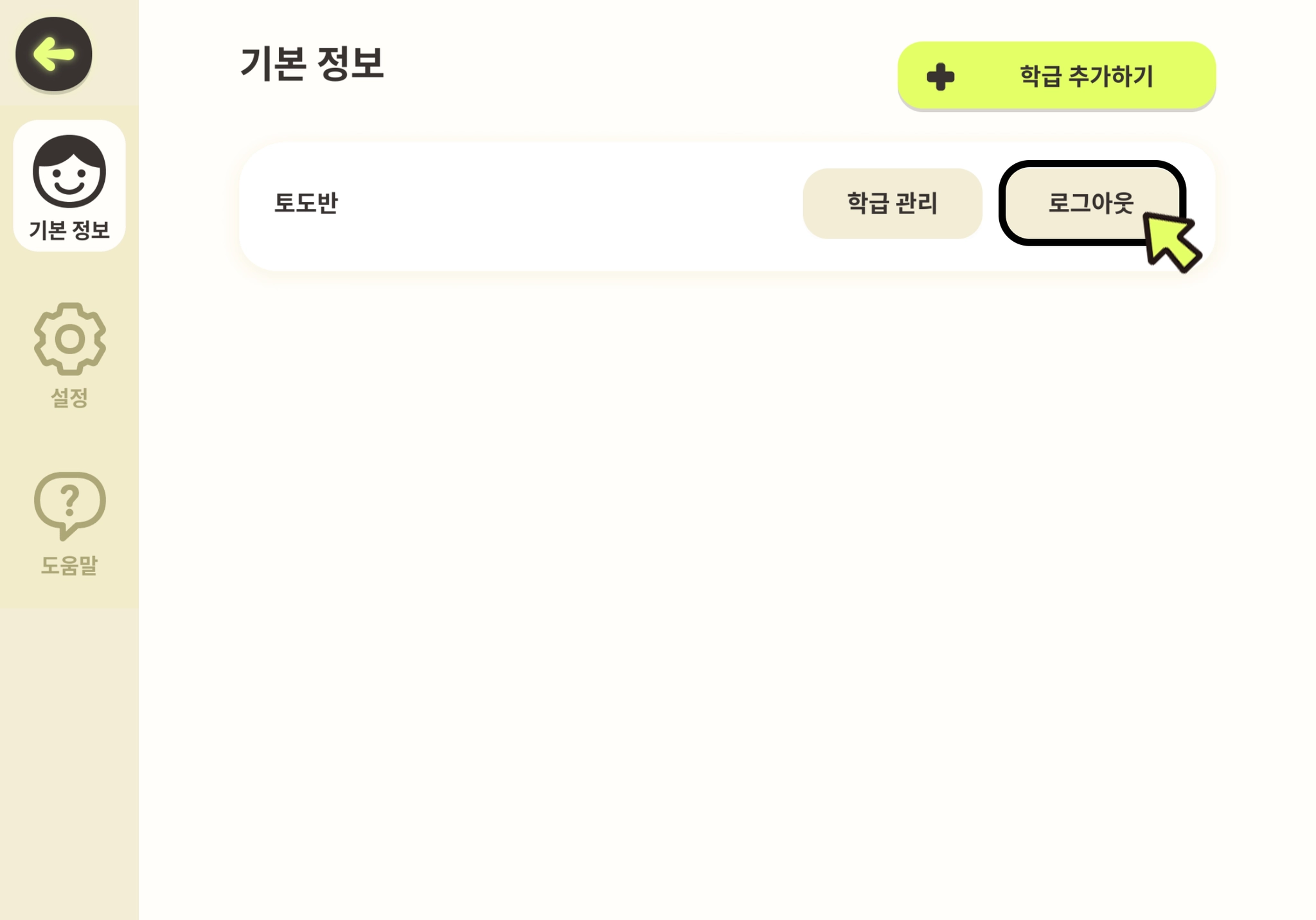특정 학급을 기기에서 더이상 사용하지 않게 되었을 때는 학급 로그아웃을 할 수 있습니다.