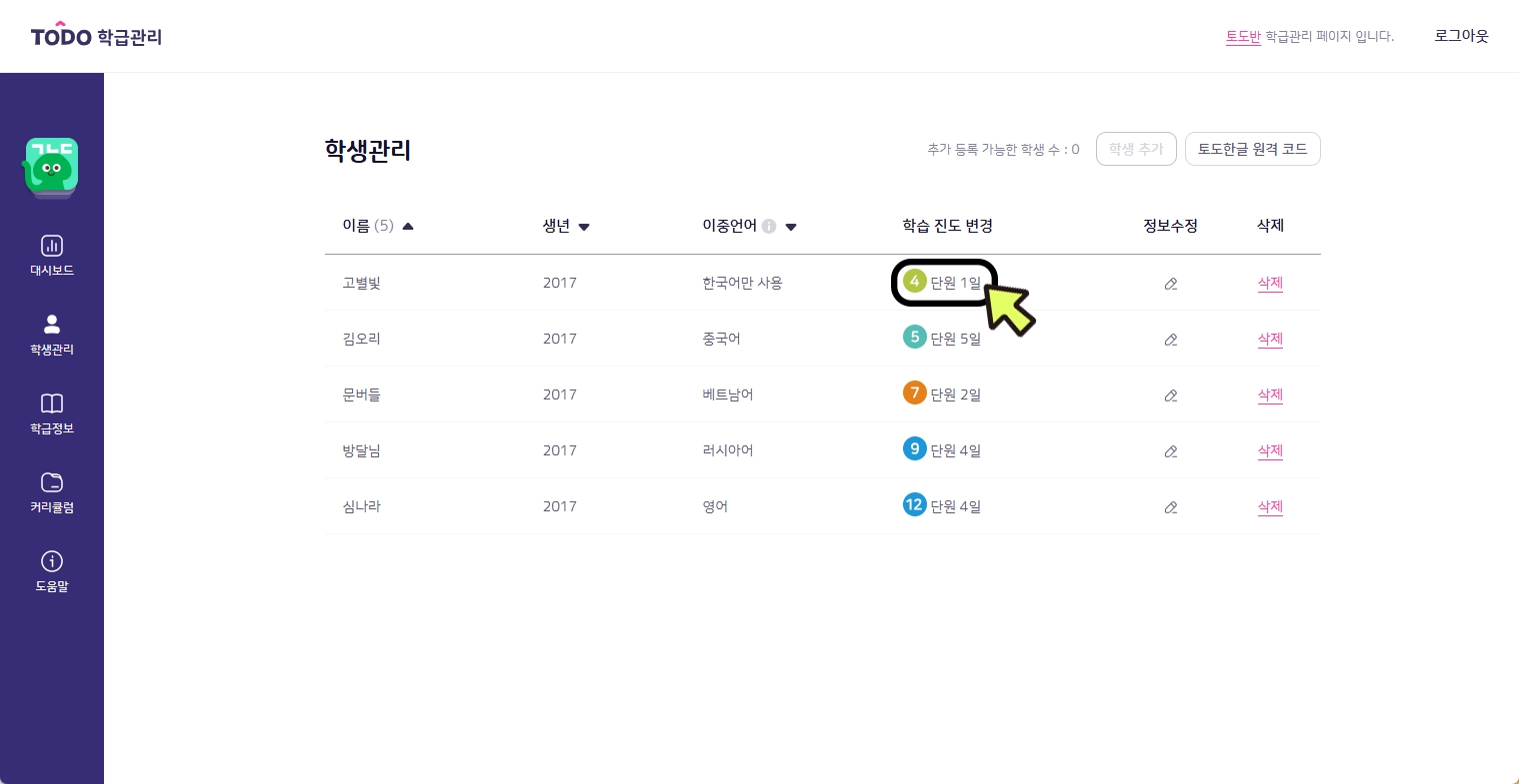 학습 진도를 변경하고자 하는 학생의 현재 진도를 클릭합니다.