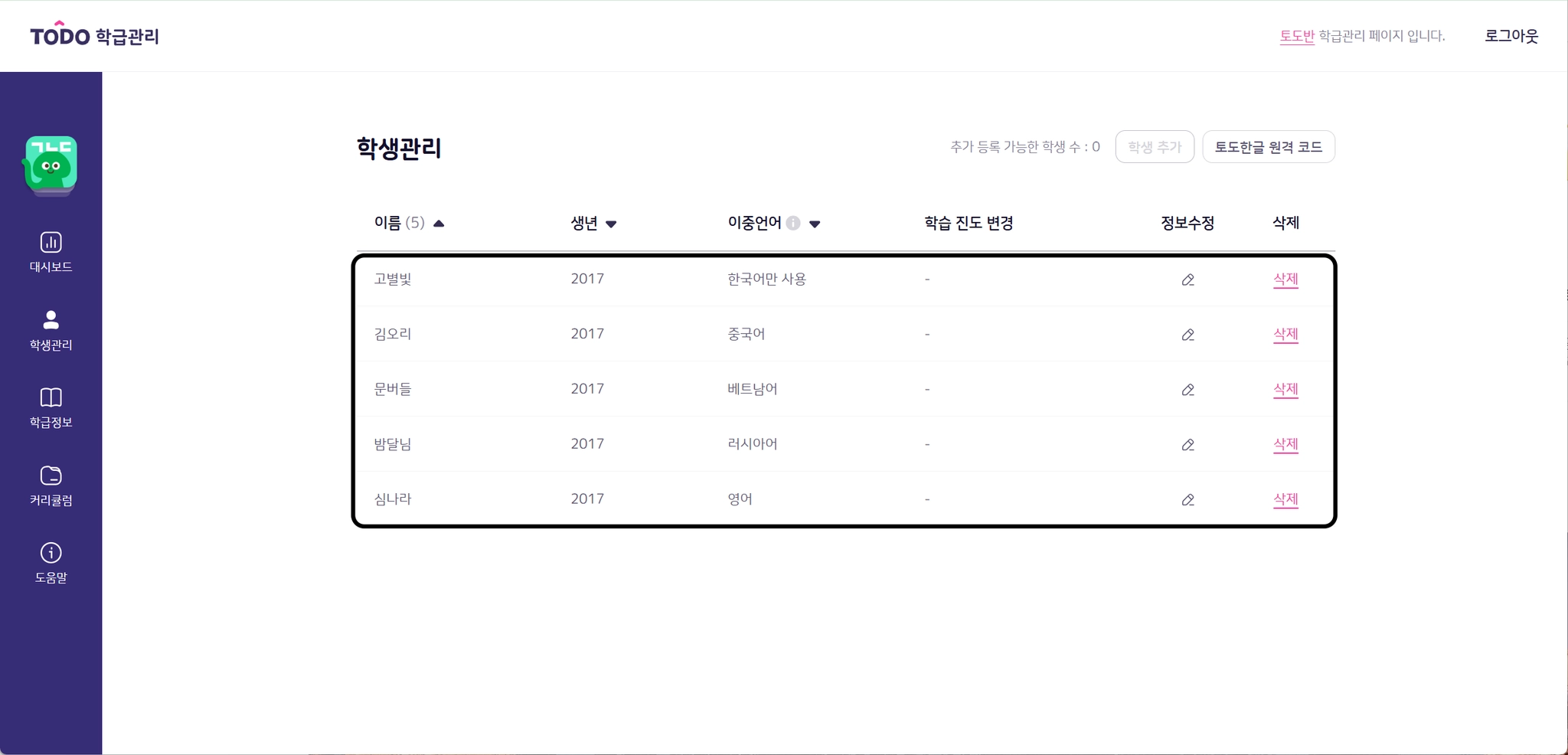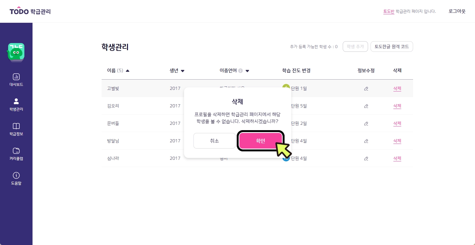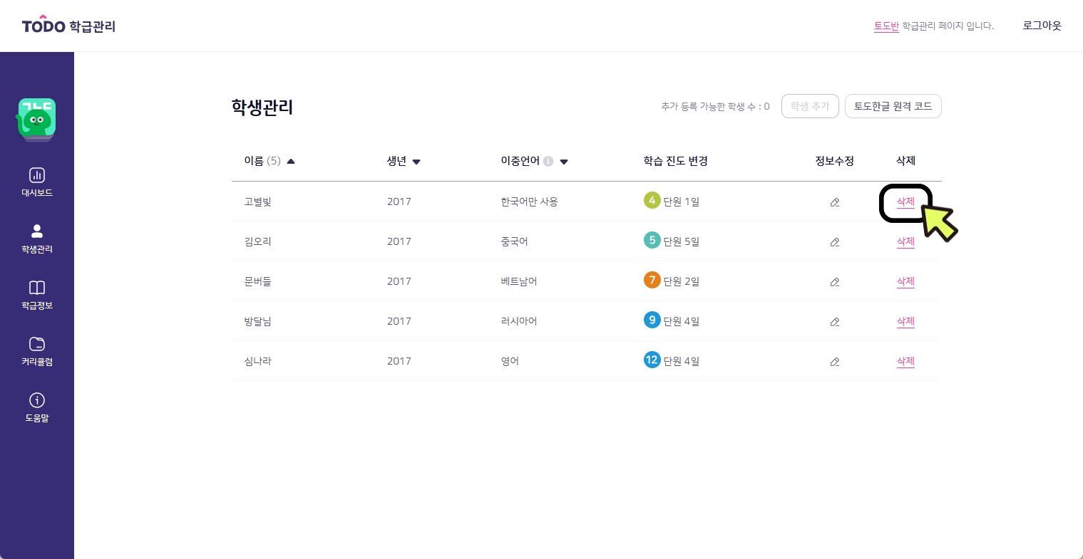1. [학생관리] 탭에서 삭제하고자 하는 학생 이름 옆의 [삭제] 버튼을 클릭합니다.