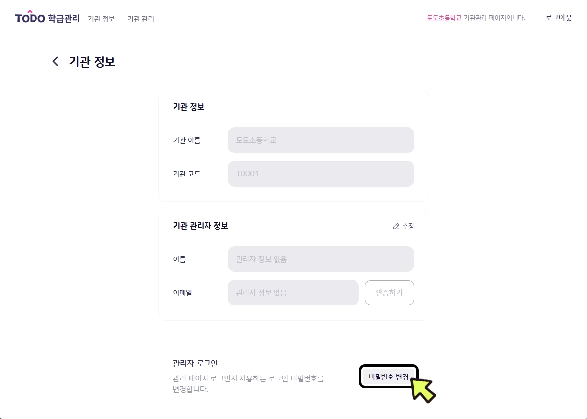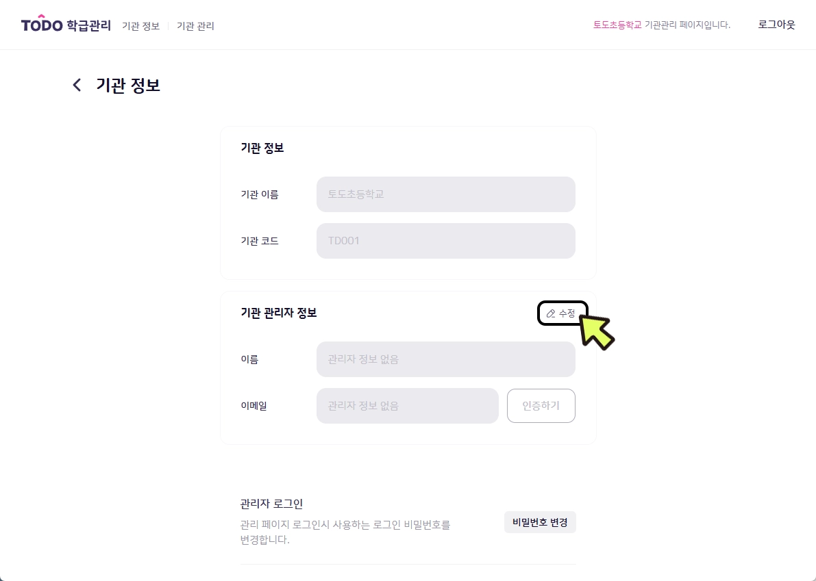 기관 관리자 정보 박스에서 [수정]을 클릭합니다.