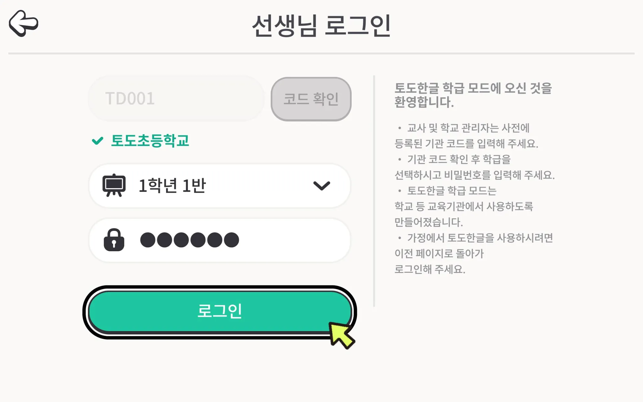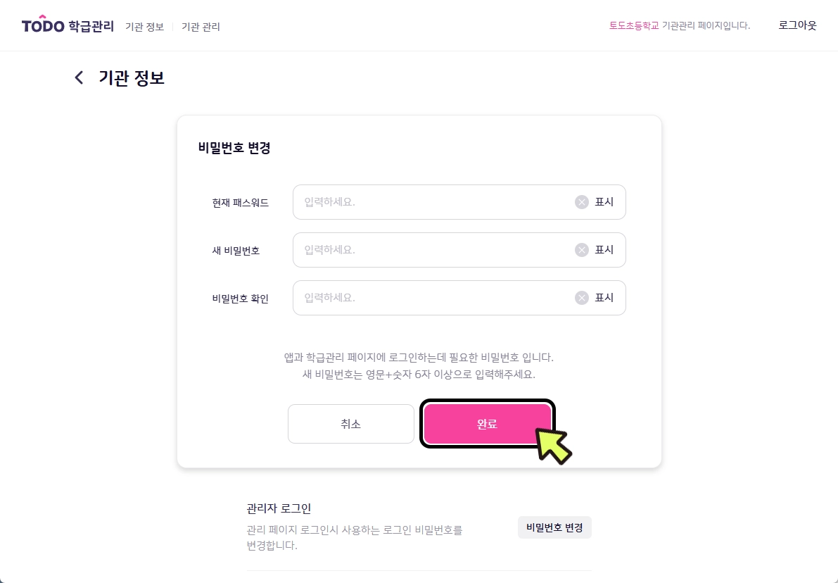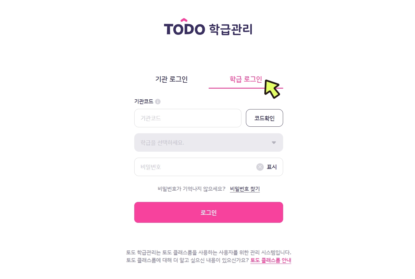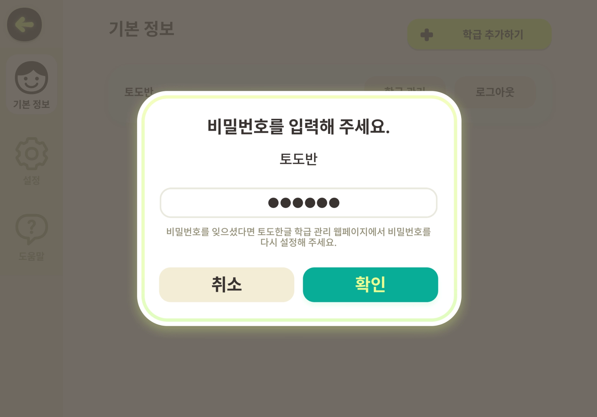 비밀번호는 로그인, 학급 추가, 학급 관리에 사용되는 것으로 토도 학교팀이 생성하여 기관 내 담당자에게 전달해 드립니다. 비밀번호를 모르시는 경우 기관 내 담당자 또는 토도 학교팀에 문의해 주세요.