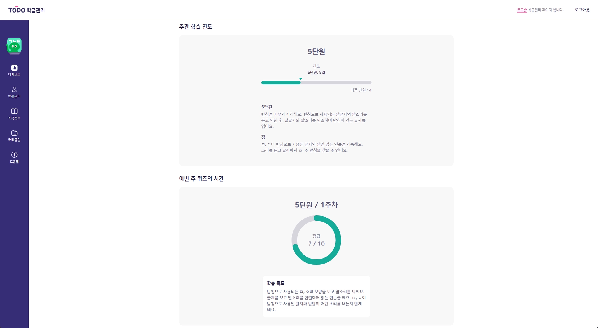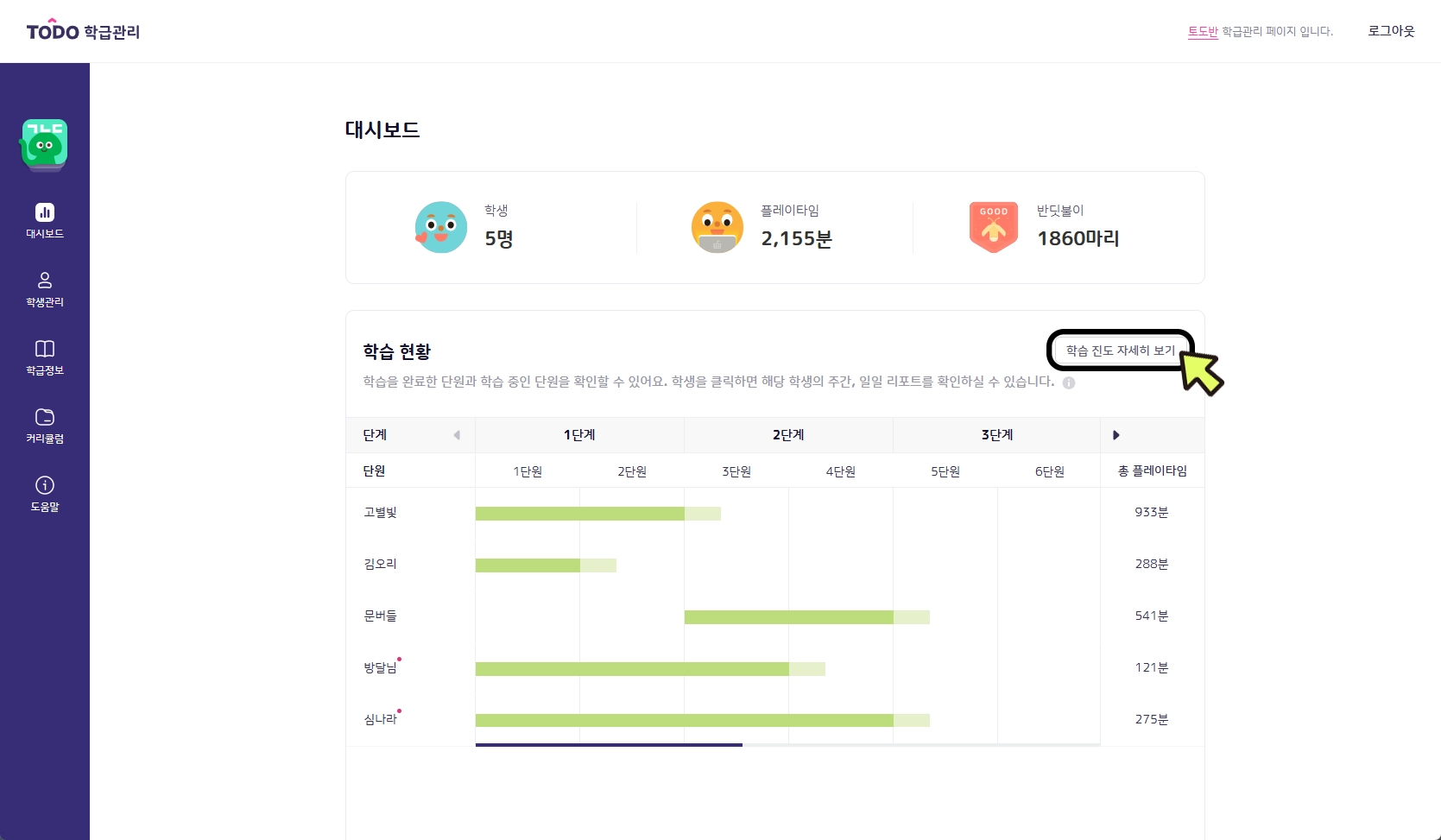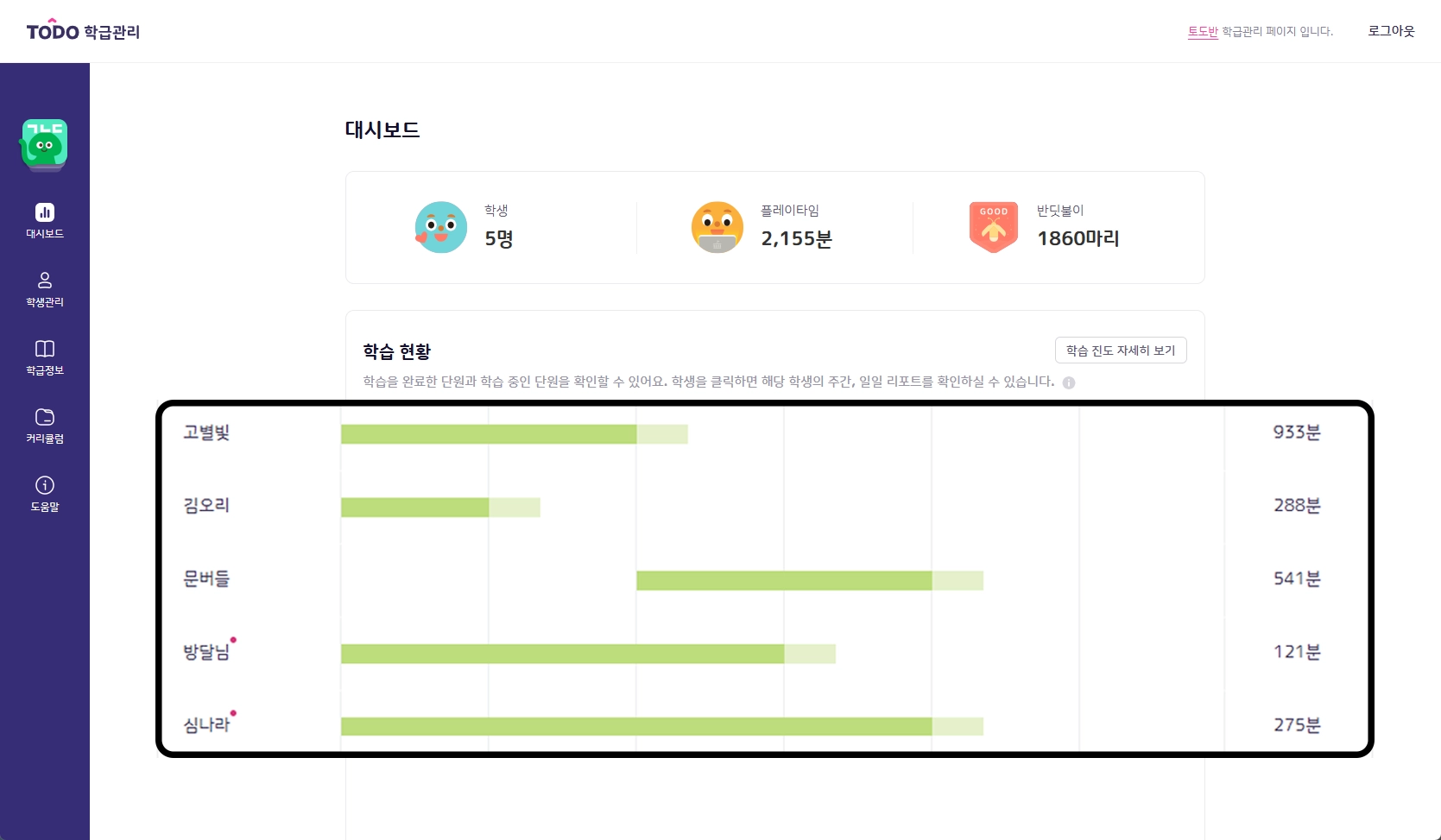 학습 현황 그래프: 학생들의 진도를 한눈에 확인할 수 있습니다.