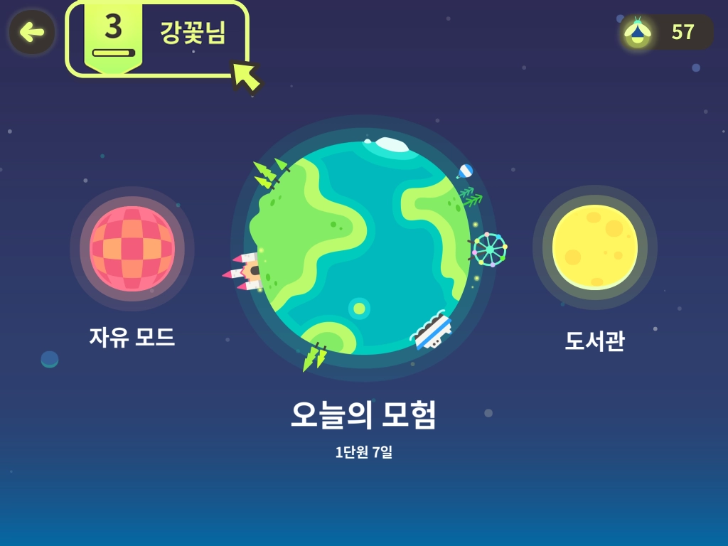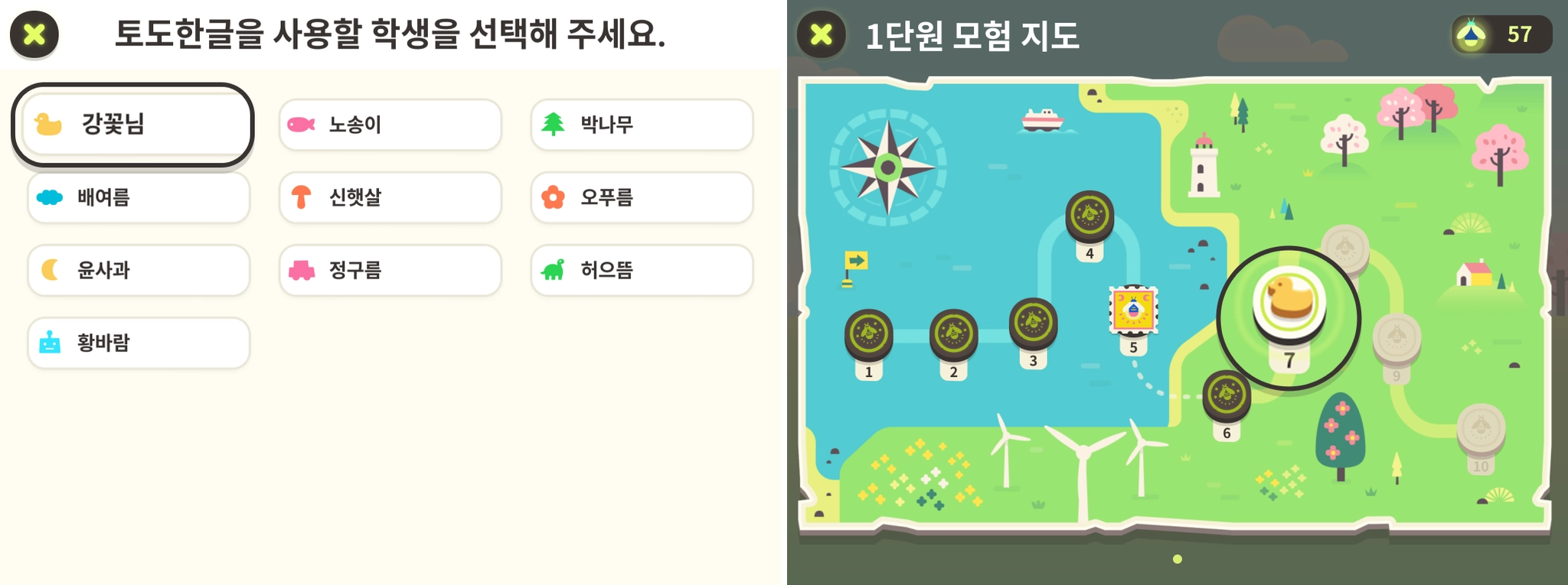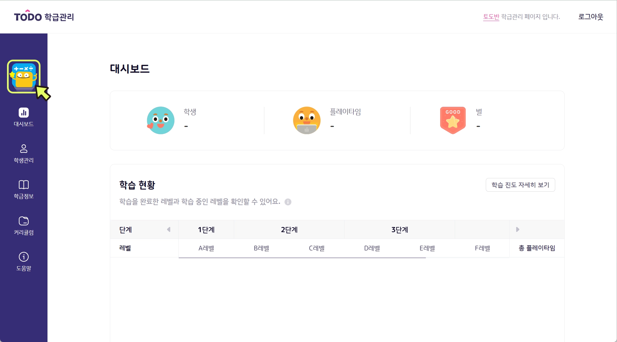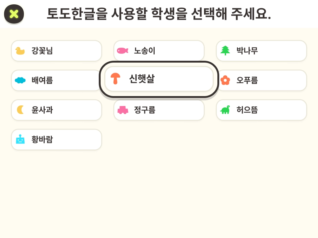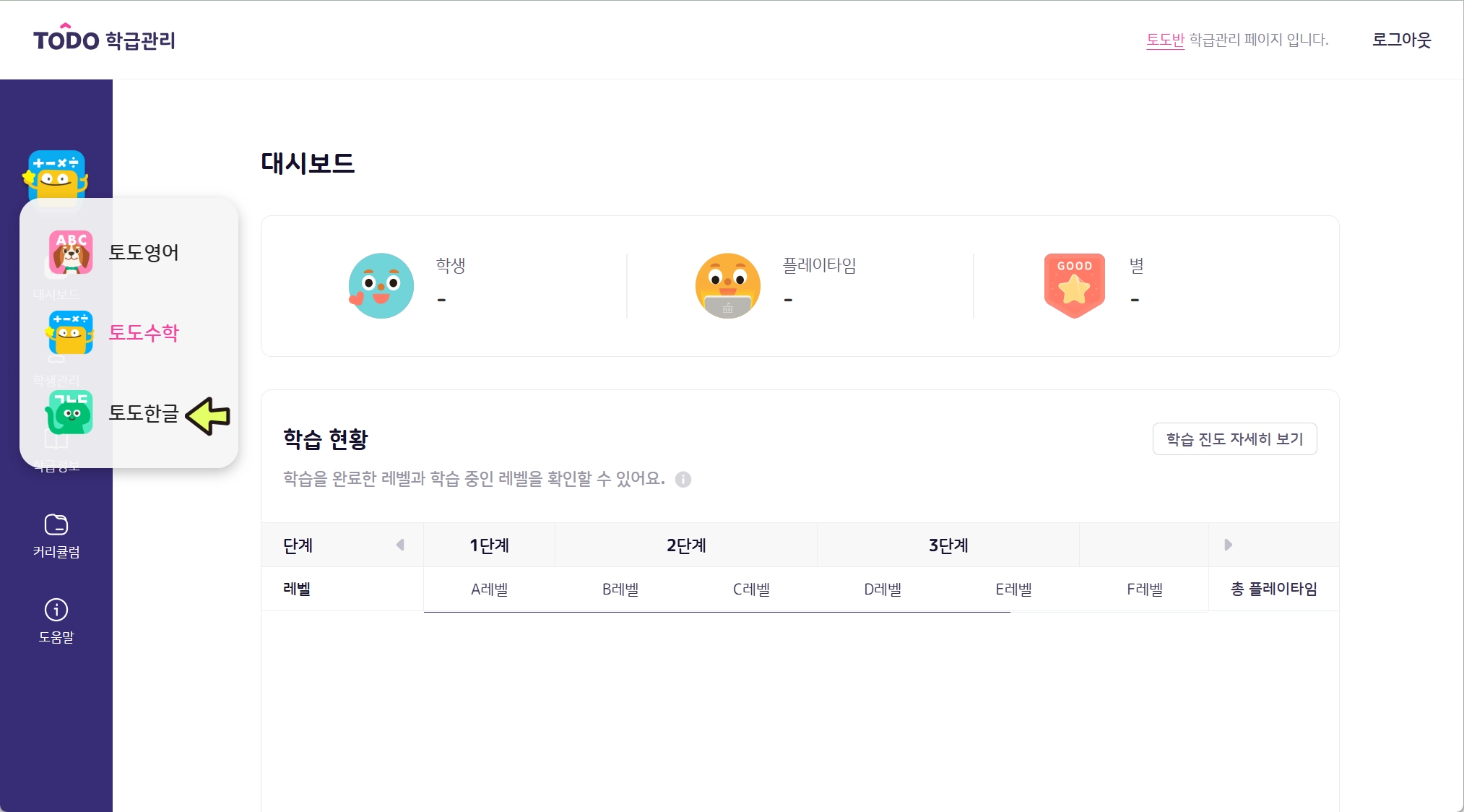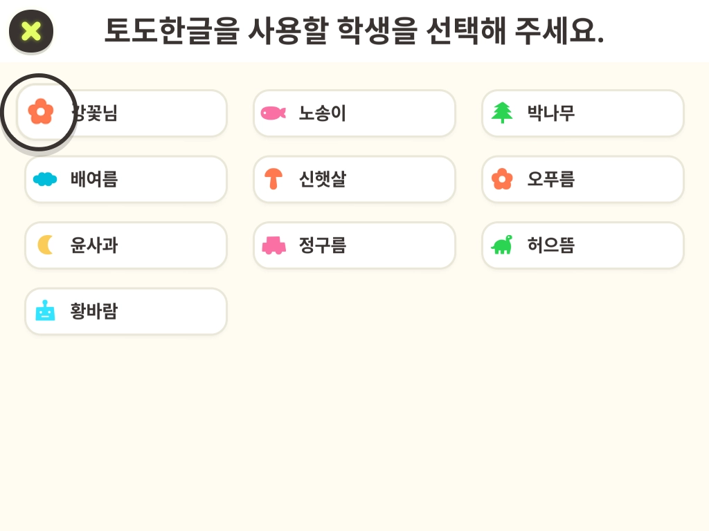 사용 과목이 2개 이상인 경우, 왼쪽 상단의 아이콘으로 먼저 과목을 확인해 주세요. 토도한글로 설정되어 있지 않다면 아이콘을 눌러 토도한글을 선택해 주세요.