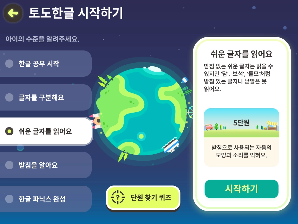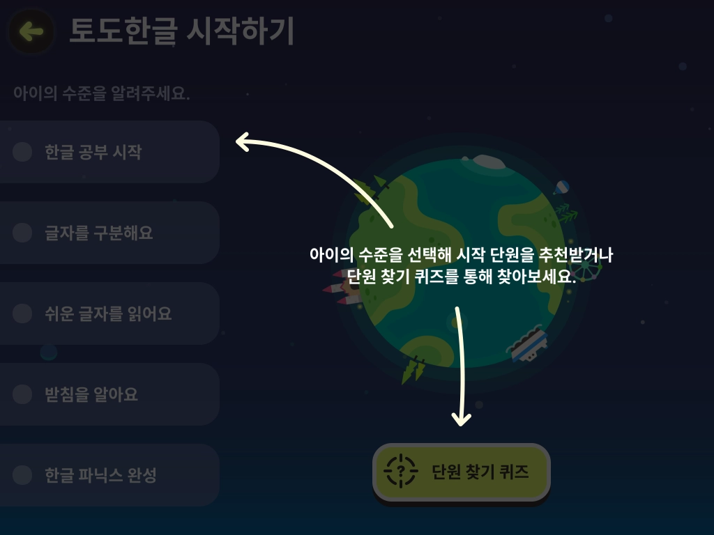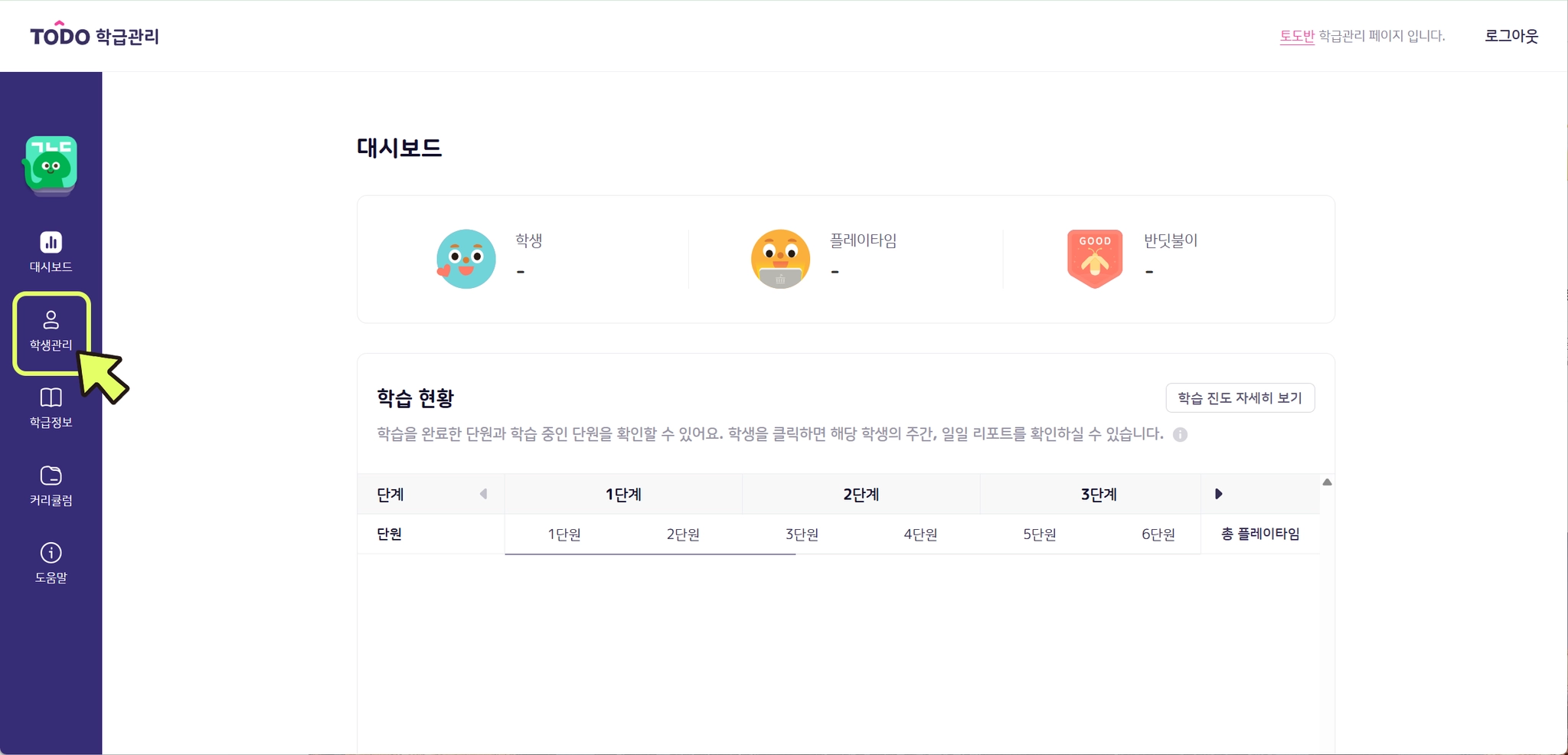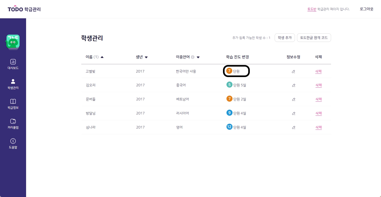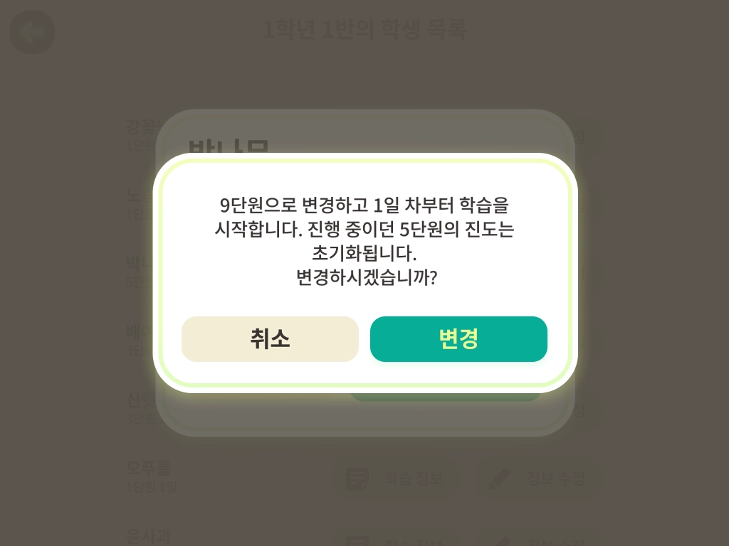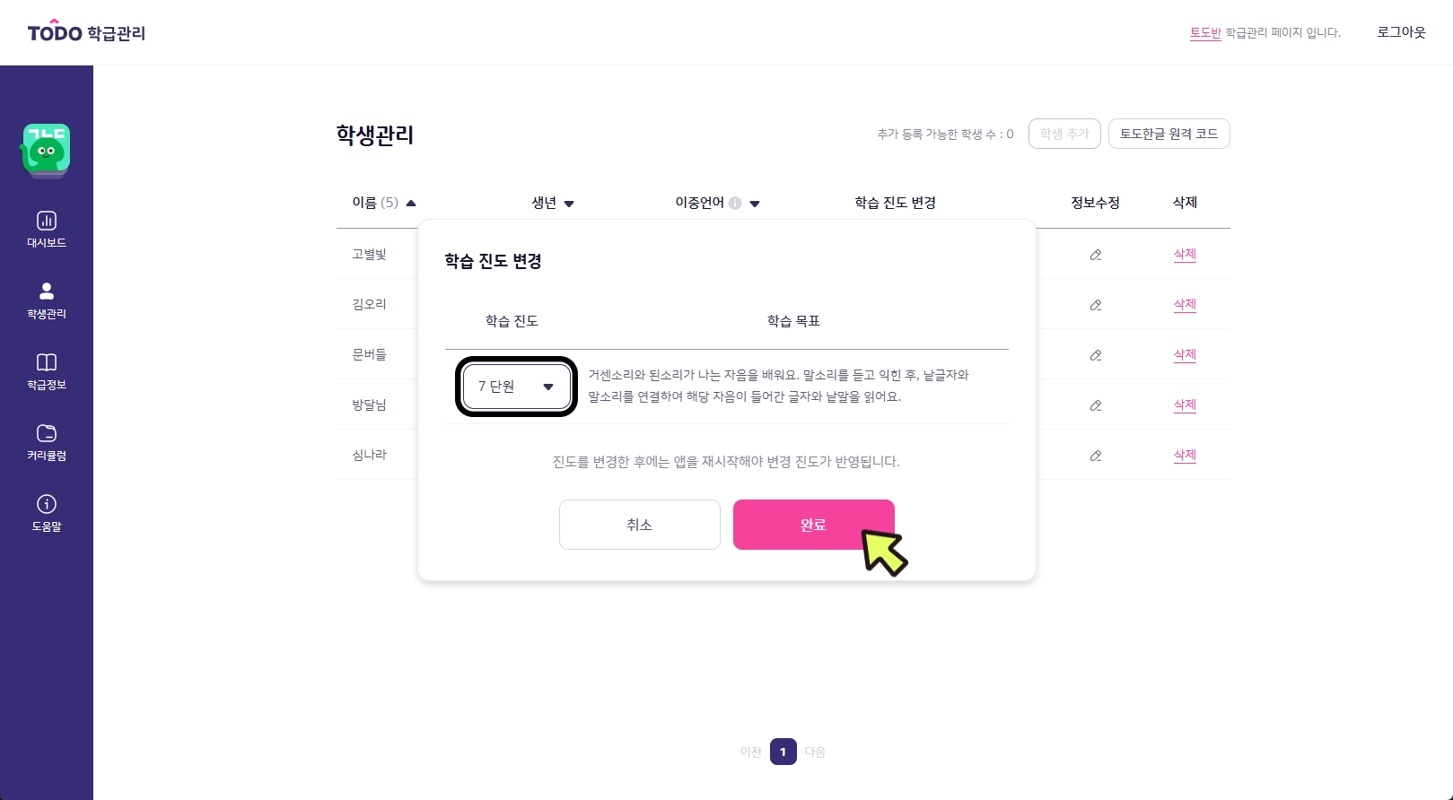 현재 학습 중인 내용이 학생의 수준에 비해 어렵거나 쉬울 때 학습 진도를 변경할 수 있습니다. 학습 진도 변경은 학급관리 페이지와 토도한글 앱에서 모두 가능합니다.