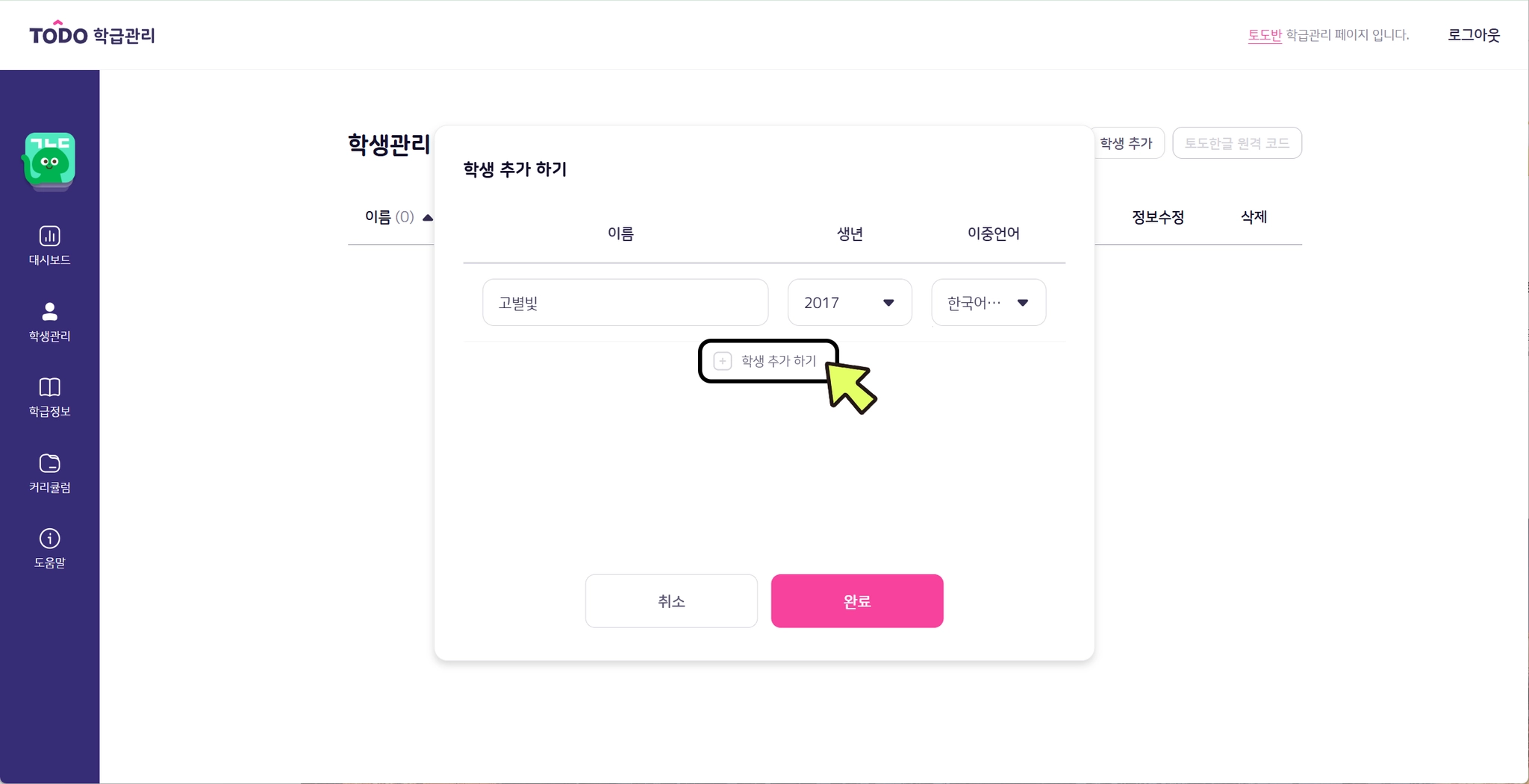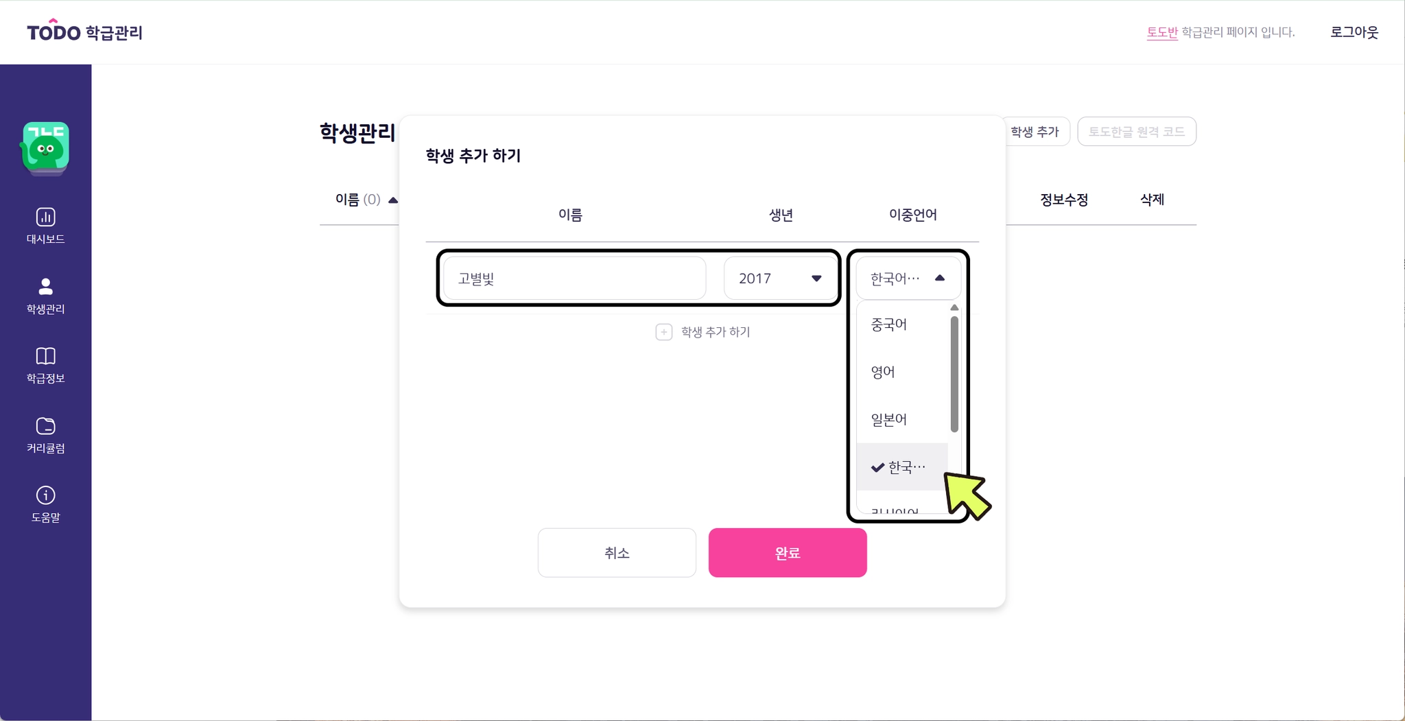 4. 학생 정보를 입력합니다. (이름, 생년, 이중언어*)