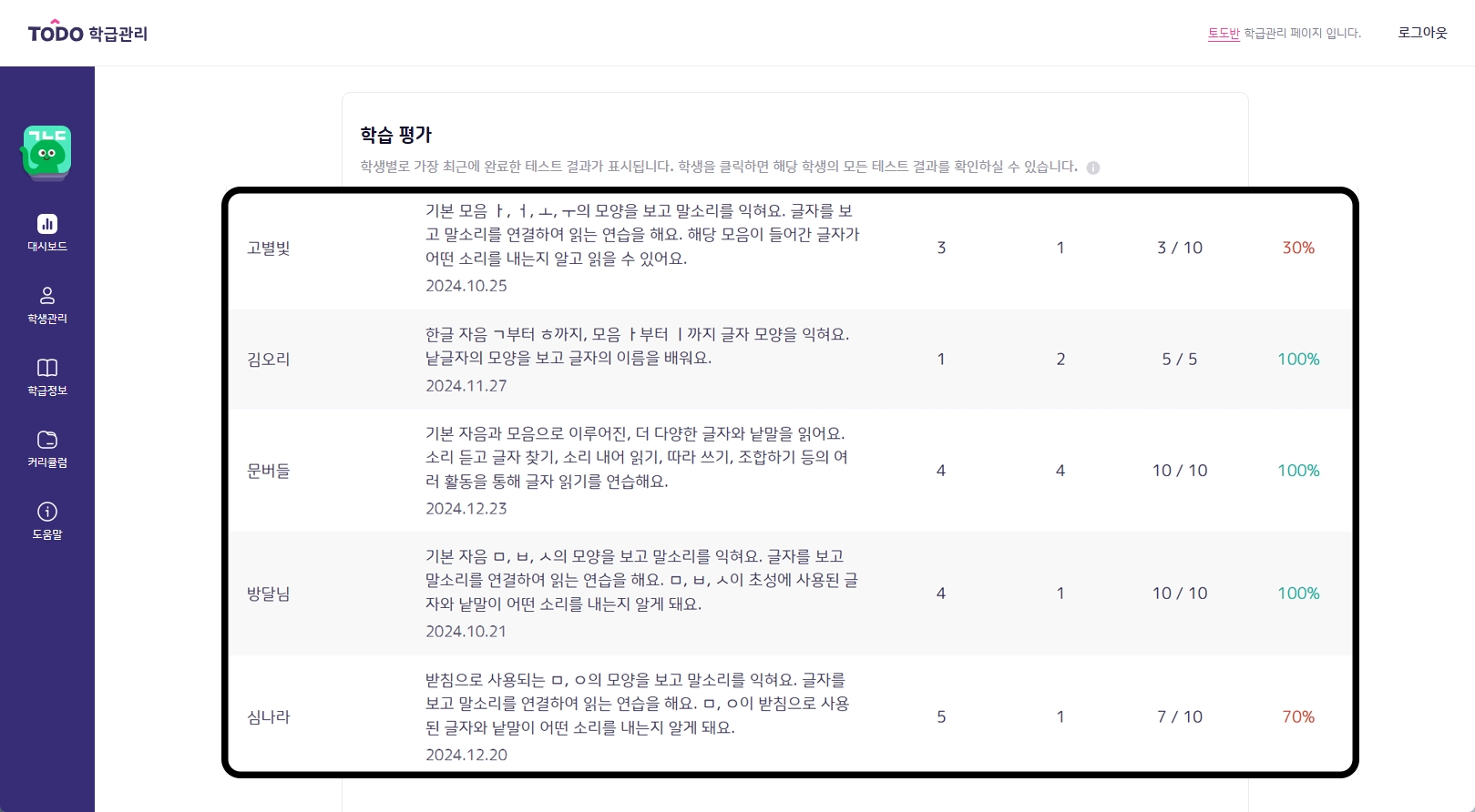 학습 평가 표 : 학생들이 최근에 완료한 테스트 결과를 한눈에 확인할 수 있습니다.