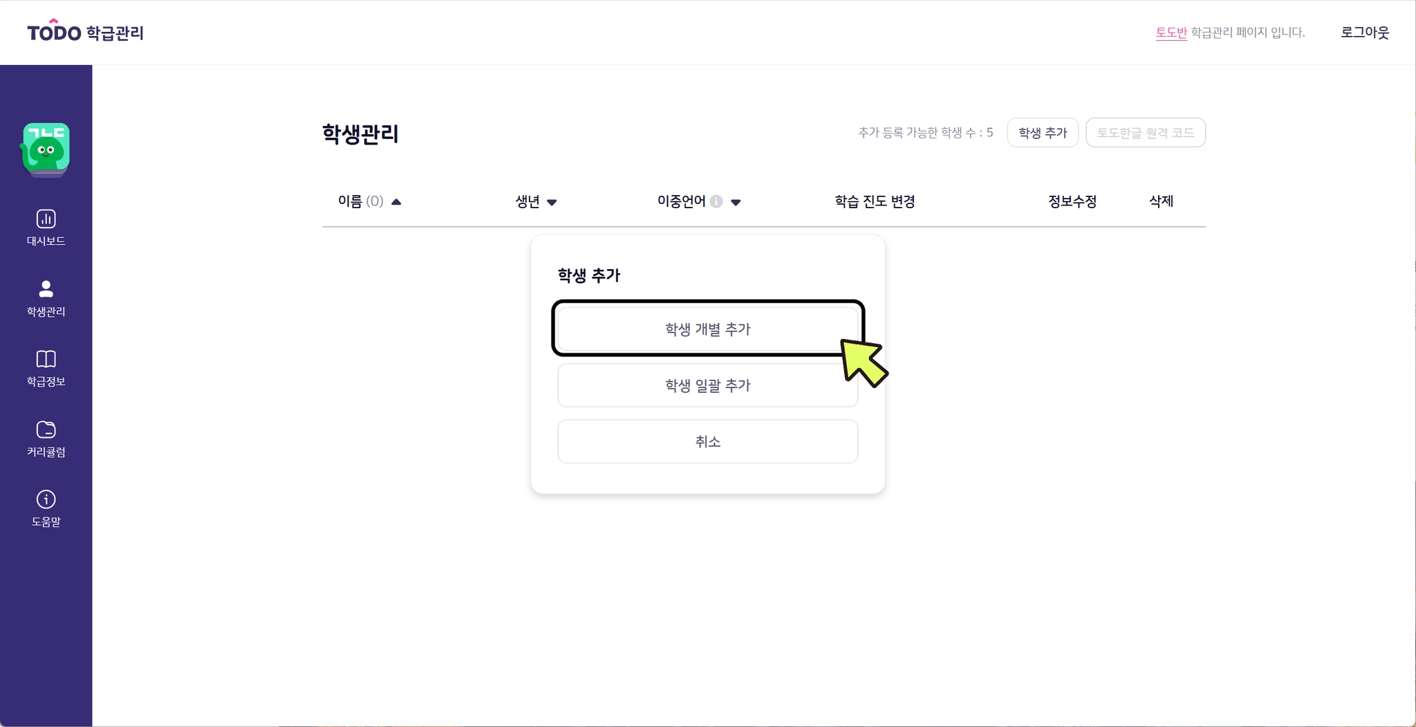 3. [학생 개별 추가]를 클릭합니다.