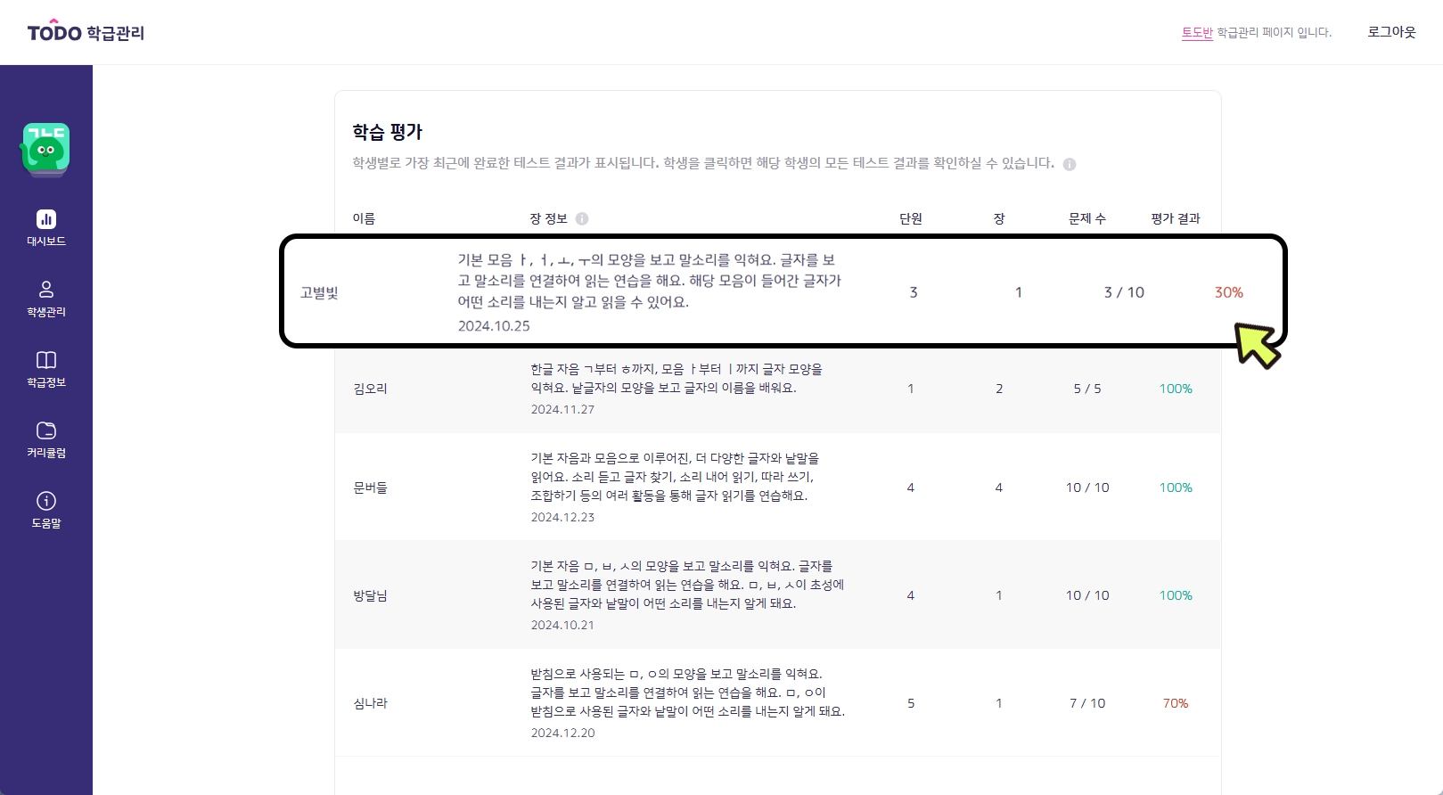표의 학생 이름을 클릭하면 학생별 학습 평가 확인이 가능합니다.