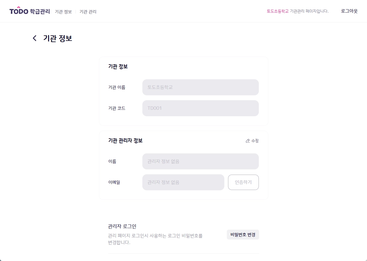 2. 기관 정보 조회 및 수정이 가능합니다.