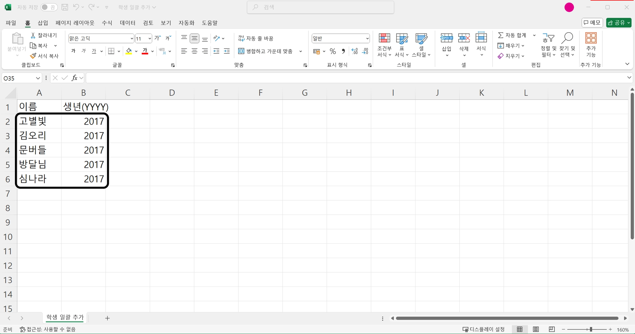 다운로드 받은 CSV양식에 학생 정보를 입력합니다.