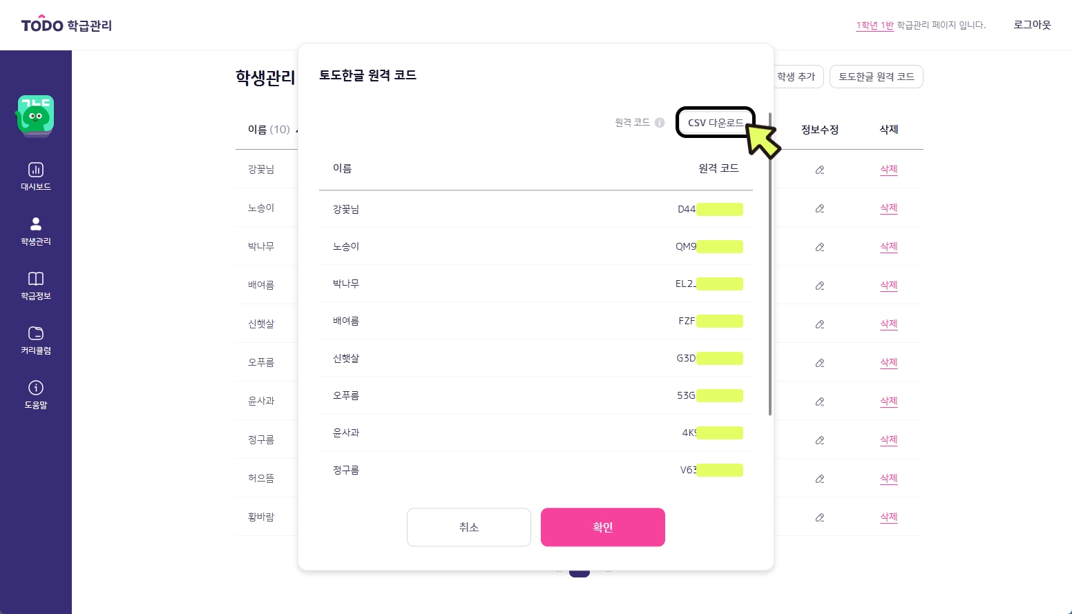 2. 각 학생에게 할당된 원격 코드를 확인하실 수 있습니다. 이 비밀번호를 학생(보호자)에게 전달합니다. (CSV 다운로드를 눌러 원격 코드를 다운로드 받으실 수 있습니다.)