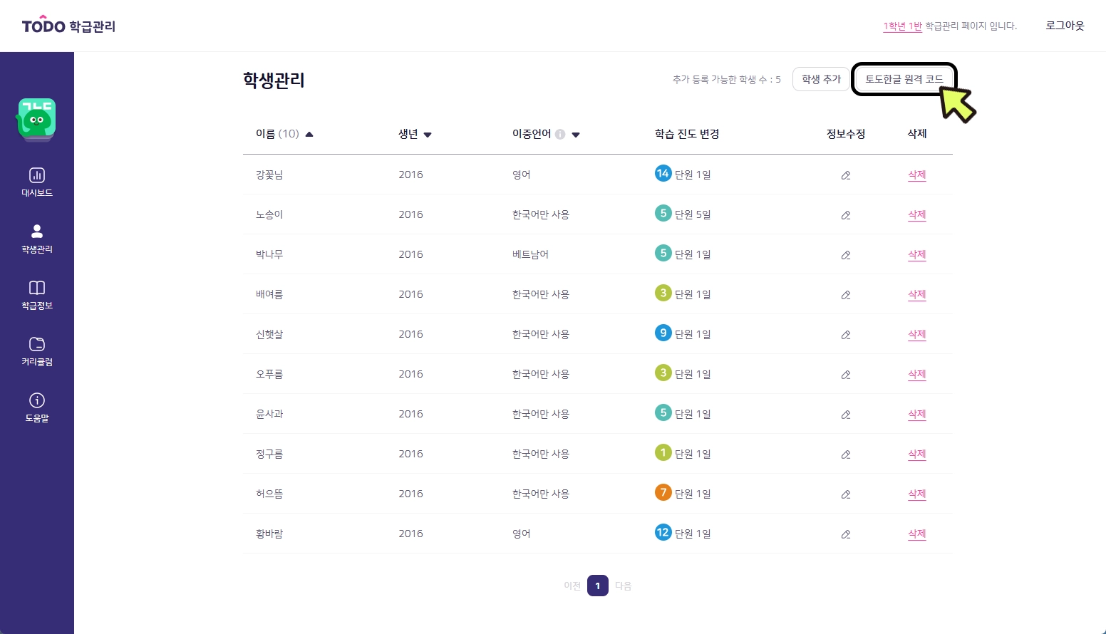 1. 학급관리 페이지의 [학생관리] 탭에서 [토도한글 원격 코드]를 클릭합니다.