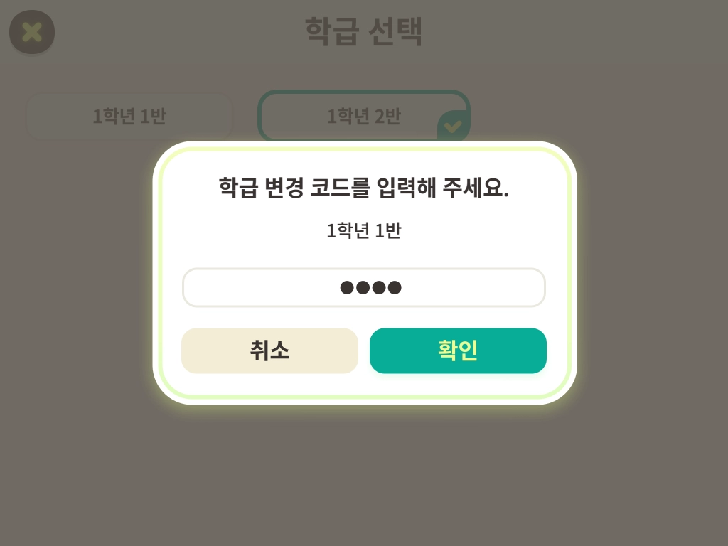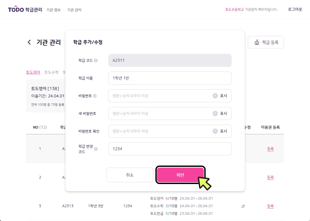 학급 변경 코드를 입력하고 [확인]을 누릅니다.