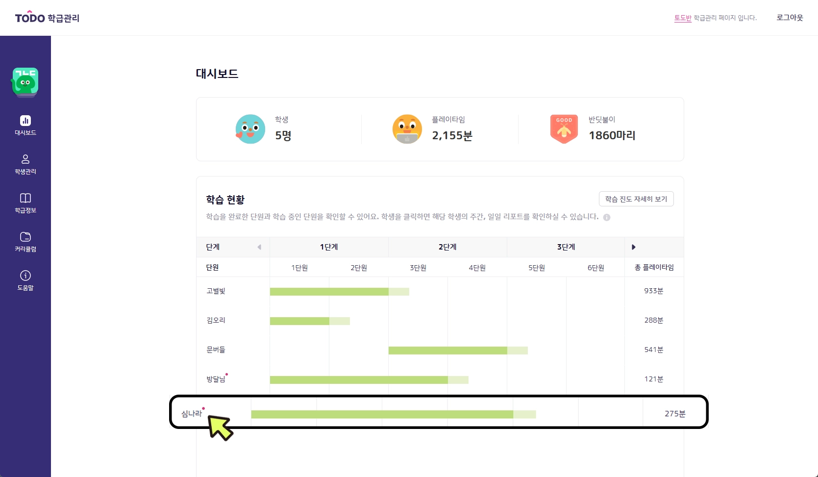 그래프의 학생 이름을 클릭하면 학생별 주간 리포트 확인이 가능합니다.
