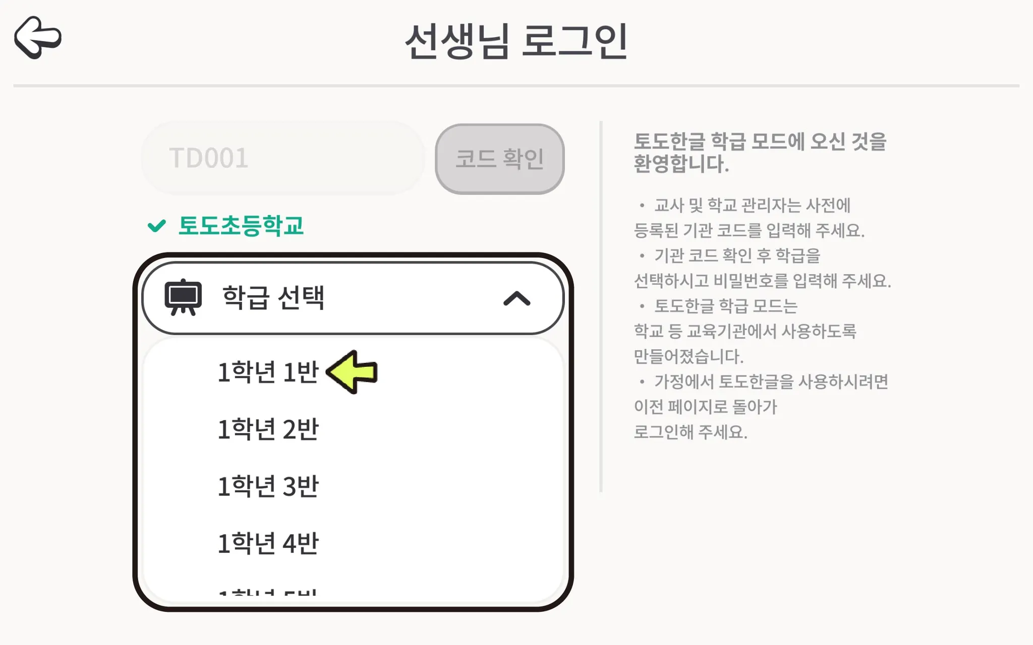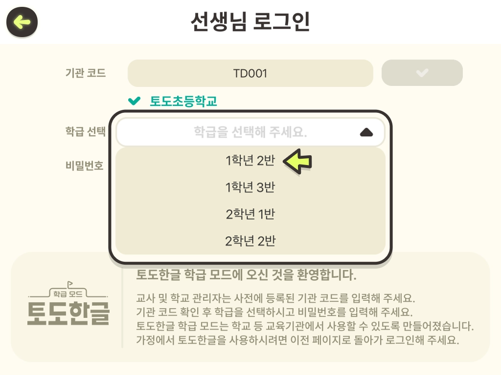 4. 기관 이름을 확인 후, 학급 선택 목록에서 로그인하려는 학급을 선택합니다.