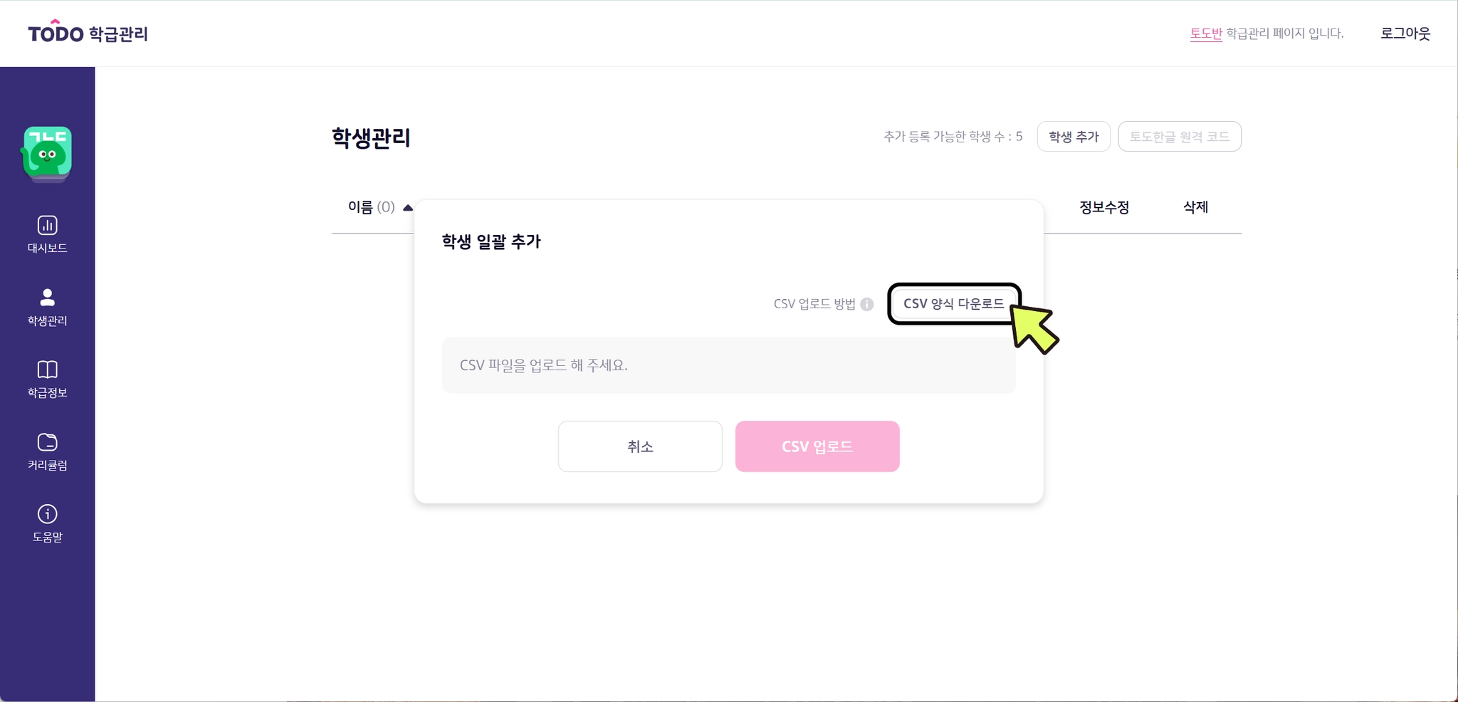 4. [CSV 양식 다운로드]를 클릭합니다.