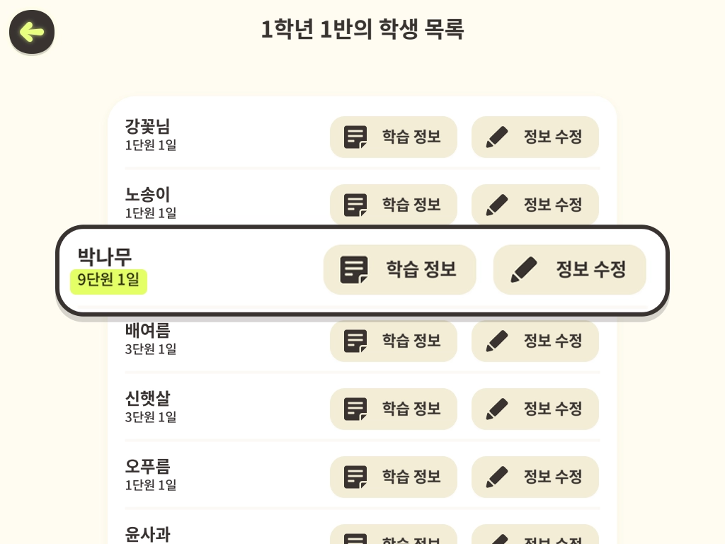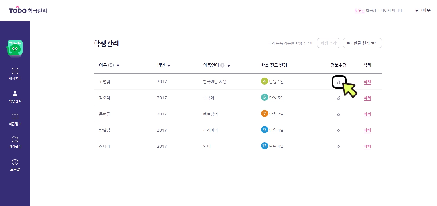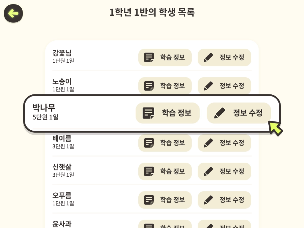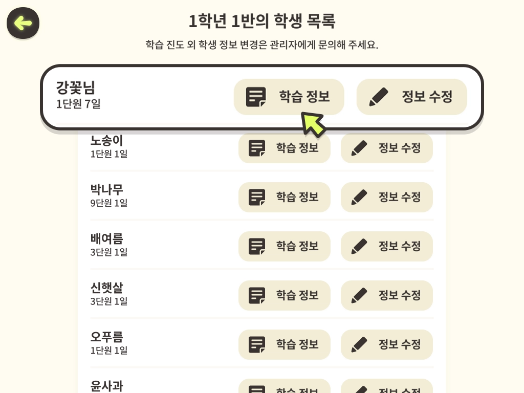 5. 해당 학급의 학생 목록에 들어왔습니다. 학습 진도 변경을 원하는 학생 이름 우측의 [정보 수정]을 누릅니다.