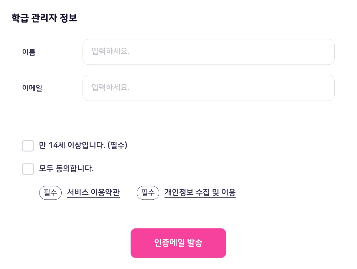 처음 로그인하면 학급 관리자(교사)의 이름과 이메일을 입력하는 창이 뜹니다. 정보를 입력해야 학급관리 페이지를 정상적으로 사용할 수 있습니다. 비밀번호 분실 시 비밀번호 설정을 위한 인증번호가 해당 이메일 주소로 발송되므로 자주 사용하는 이메일을 입력해 주세요.