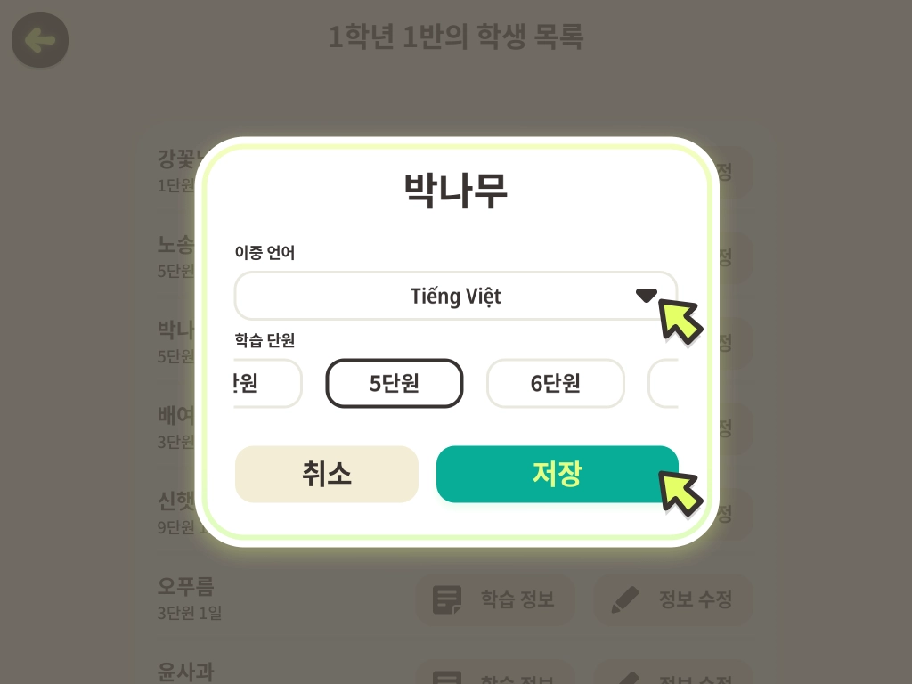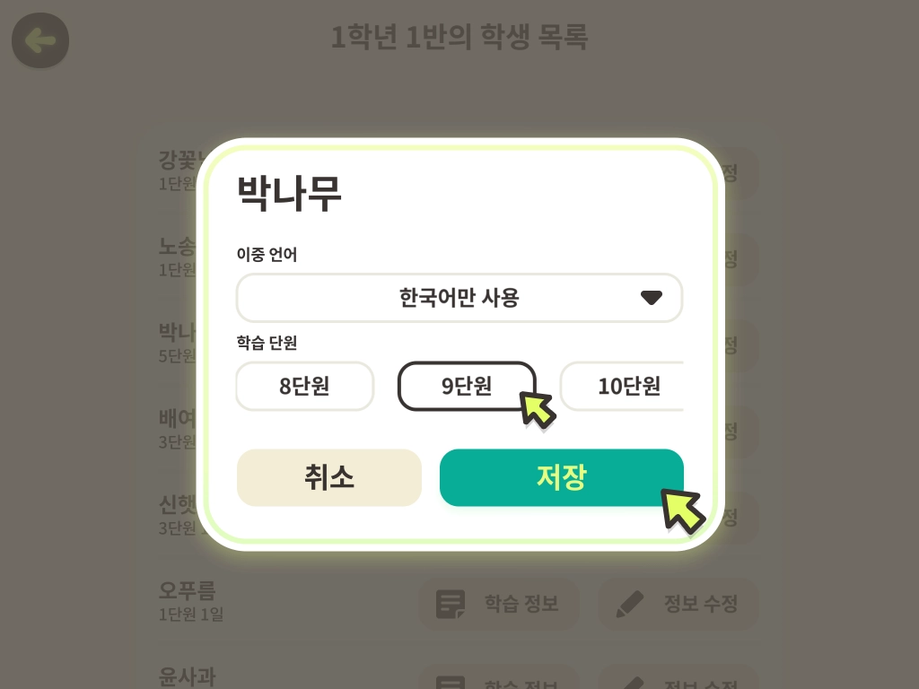 정보 수정 창이 떴습니다. 원하는 단원을 선택하고 [저장]을 누릅니다.