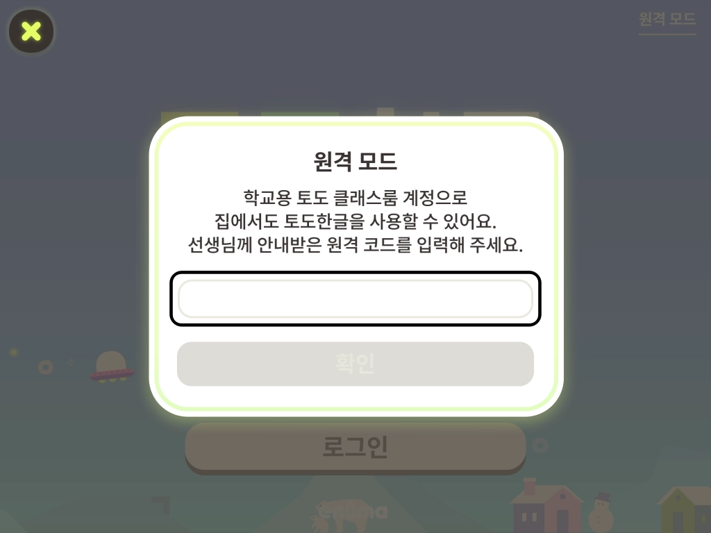 원격 코드를 입력하고 [확인]을 눌러 로그인하면 본인의 프로필로 토도한글을 사용할 수 있습니다.