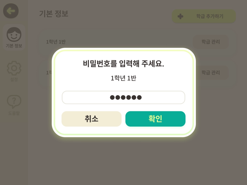 학급 변경 코드는 학급을 전환할 때 사용하는 것으로, 로그인 및 학급 추가에 사용하는 비밀번호와는 별개입니다. 학급 변경 코드는