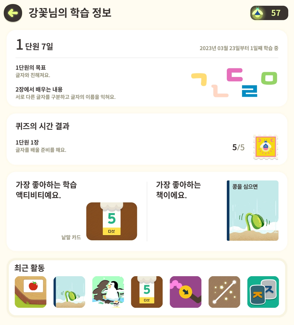 플레이타임, 액티비티 횟수, 누적 반딧불이 수가 나와있는 일별 학습 요약과 완료한 학습 콘텐츠 확인이 가능하며 PDF로 다운로드 받을 수 있습니다.